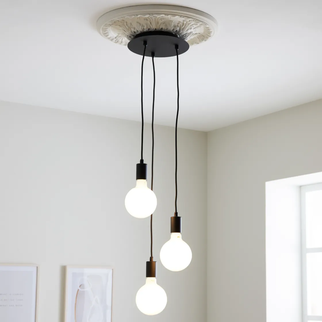 Sky-taklampe med rund takplate i metall. Sky-taklampe med rund takplate i metall, hvorav du kan justere lengden på de forskjellige ledningene, etter eget ønske. Benytt gjerne dekorpærer for et ekstra stilfullt touch.