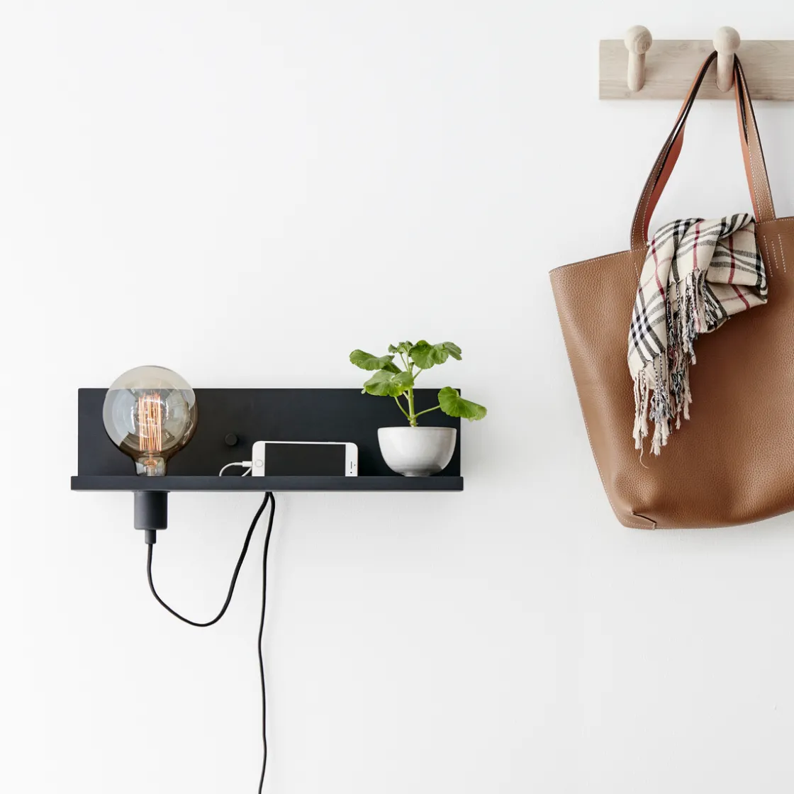 Nydelig vegglampe med dimmer og USB-inngang montert på veggplaten. Lad mobiltelefonen og nettbrettet via USB-inngangen.