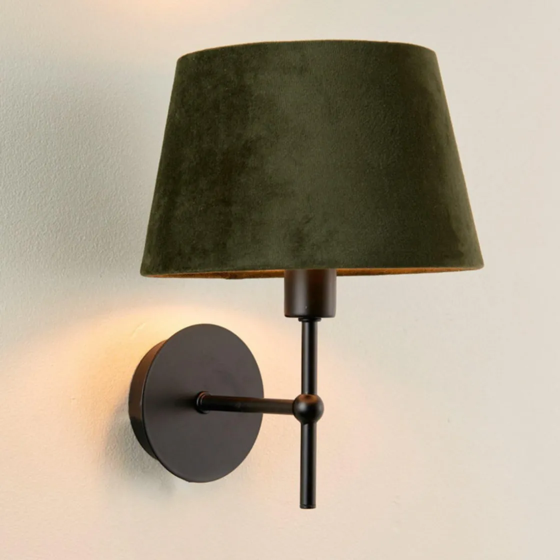 Emir er en stilfull vegglampe med olivenfarget lampeskjerm.