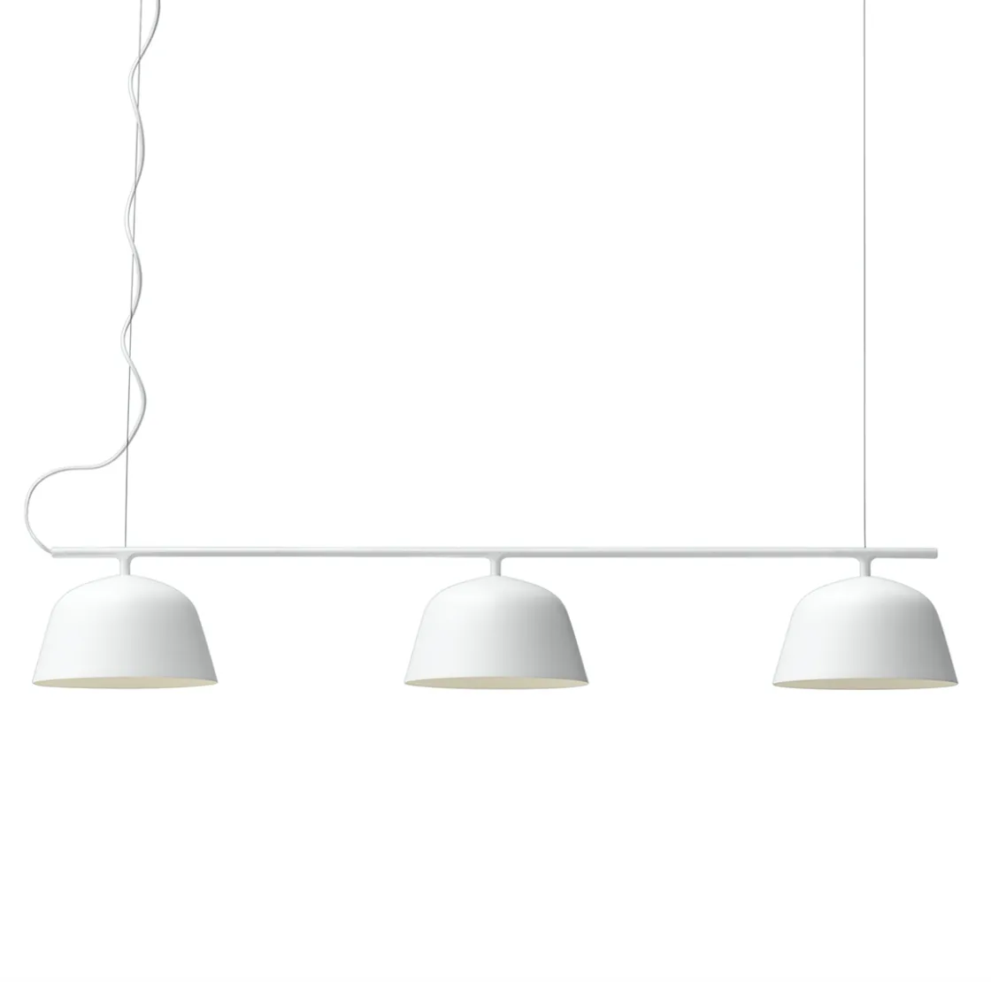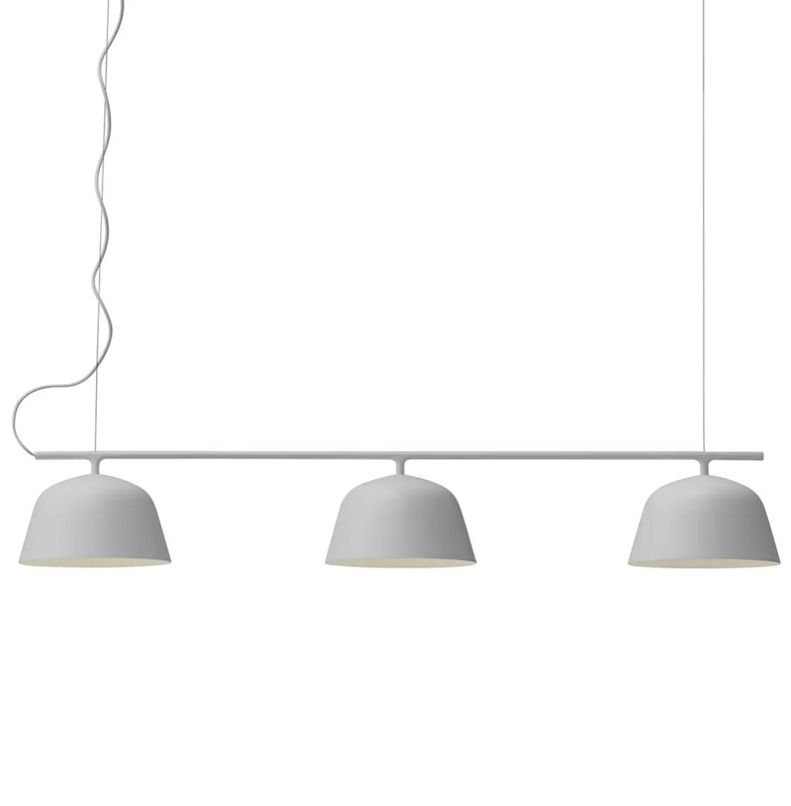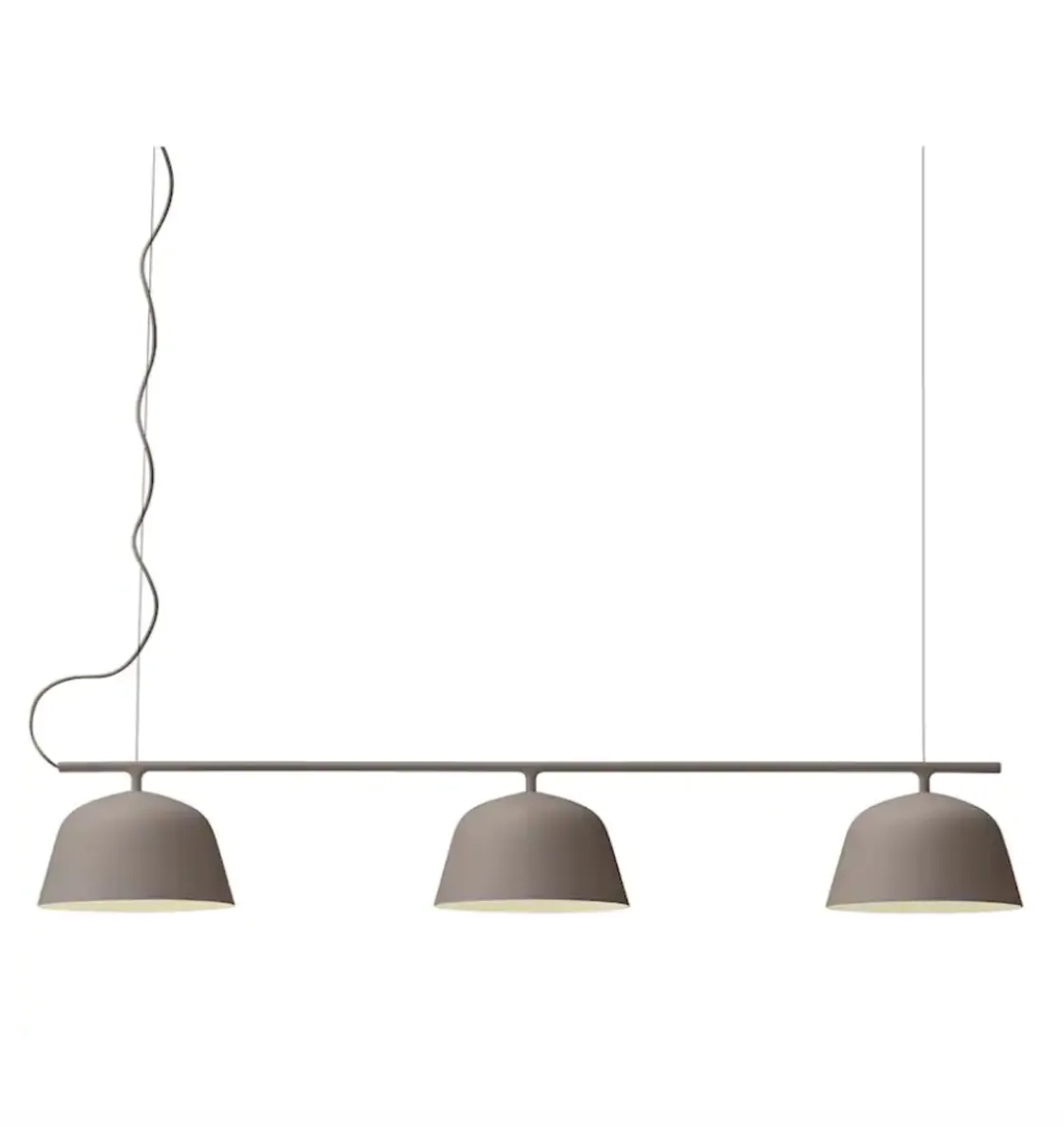 Nå kommer den populære Ambit lampen fra MUUTO i ny variant. Designet av TAF Architects. Ambit Rail produsert av Muuto er så tidløs som den er moderne, og utgjør verdiene for skandinavisk design. Ambit pendelen er laget av håndspunnet aluminium som er håndmalt. Den har fått en hvitmalt innside for å øke kontrasten til sin utvendige nyanse og forsterke lyset. Flott over spisebord, de tar seg også godt ut i kontorlandskap og i butikker. Ledningen er av gummi og har samme farge som lampen.