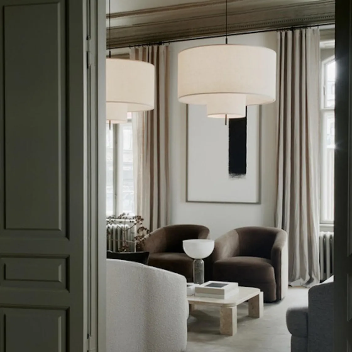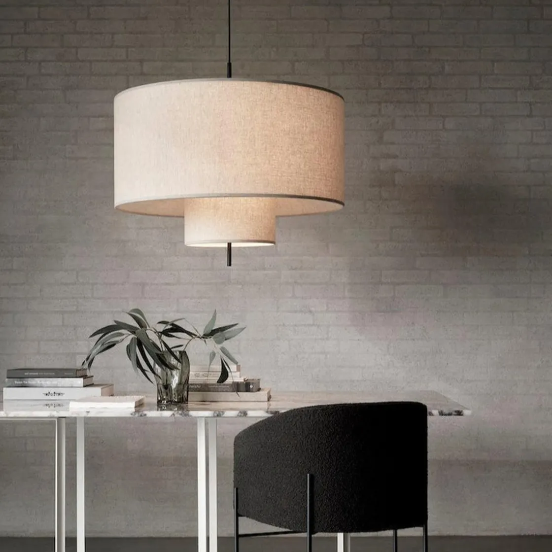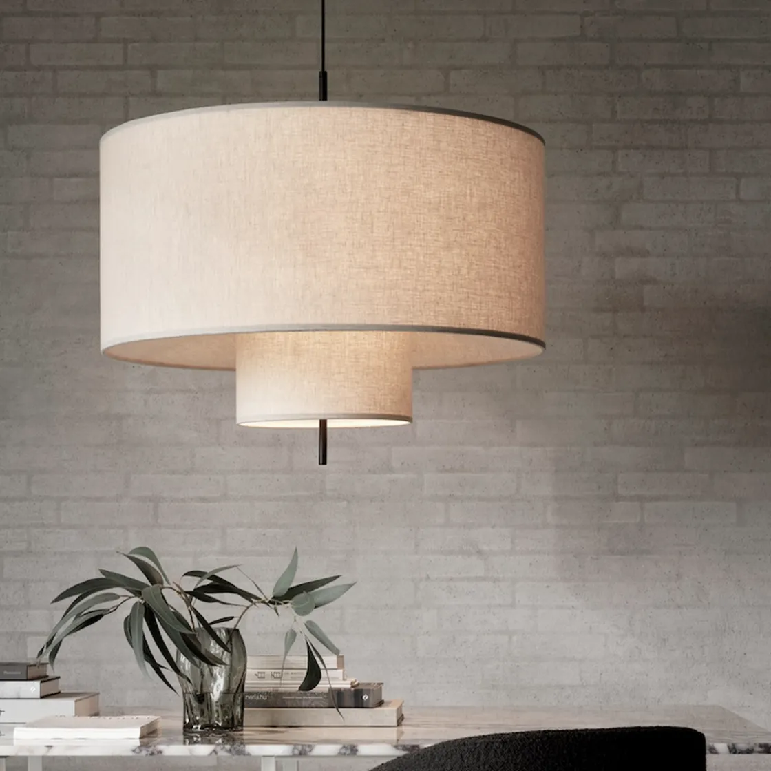 Margin taklampe kommer i flere størrelser. Den kommer også som bordlampe og som gulvlampe. Den klassiske, men moderne lampen har sandfarget tekstilskjerm med svarte detaljer. Lyset i lampen spres mykt gjennom de overlappende skjermene, noe som skaper ekstra lun stemning. Taklampen kan henge alene, men også i samling med flere i ulik størrelse.
