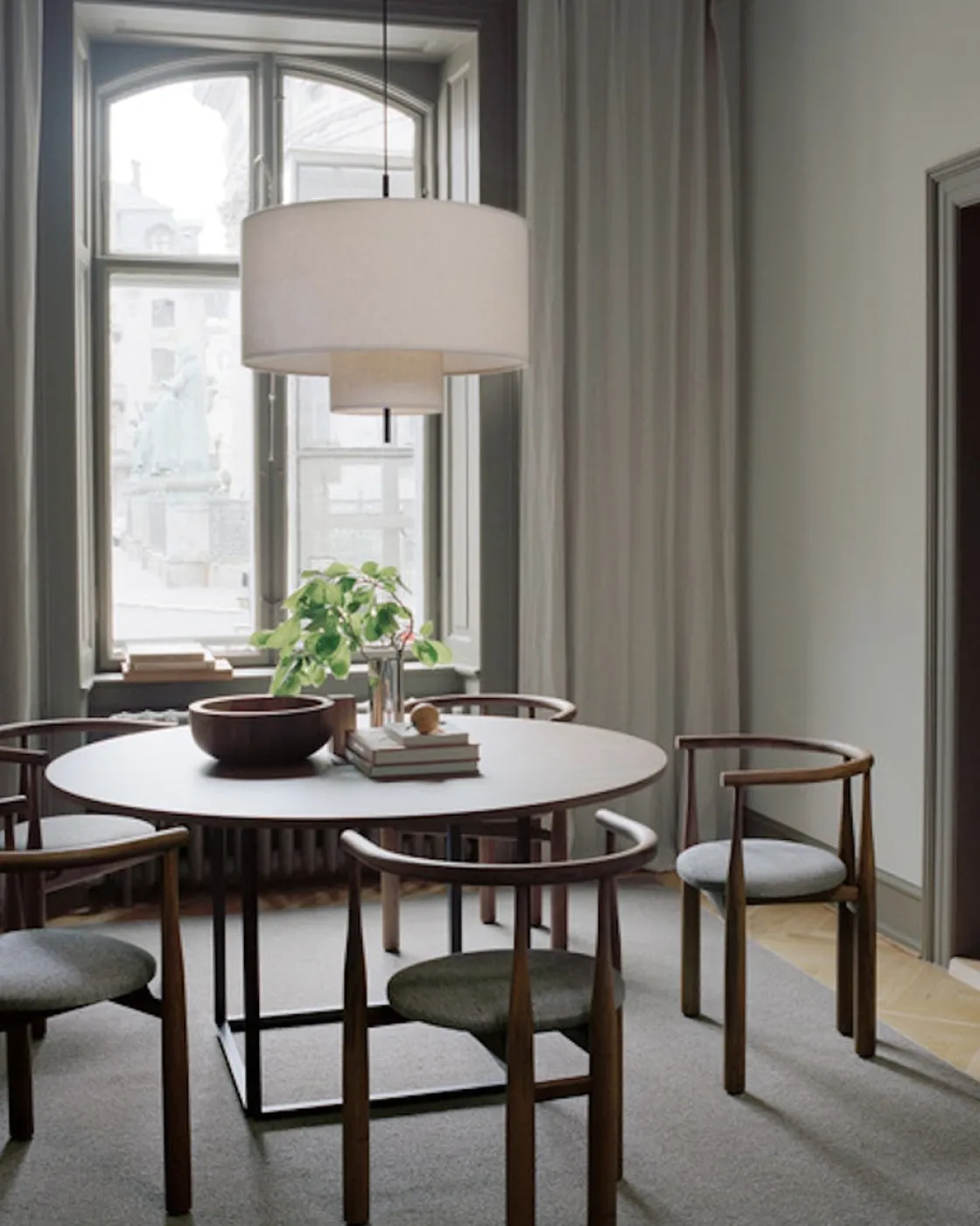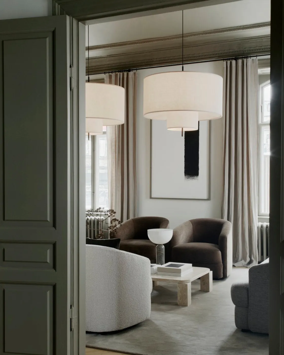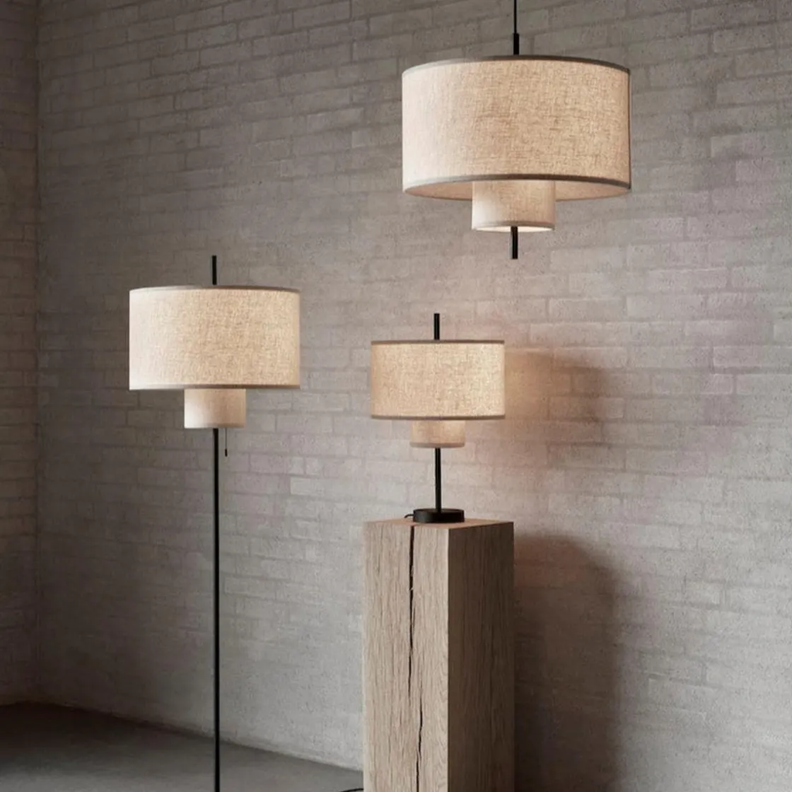 Margin taklampe kommer i flere størrelser. Den kommer også som bordlampe og som gulvlampe. Den klassiske, men moderne lampen har sandfarget tekstilskjerm med svarte detaljer. Lyset i lampen spres mykt gjennom de overlappende skjermene, noe som skaper ekstra lun stemning. Taklampen kan henge alene, men også i samling med flere i ulik størrelse.