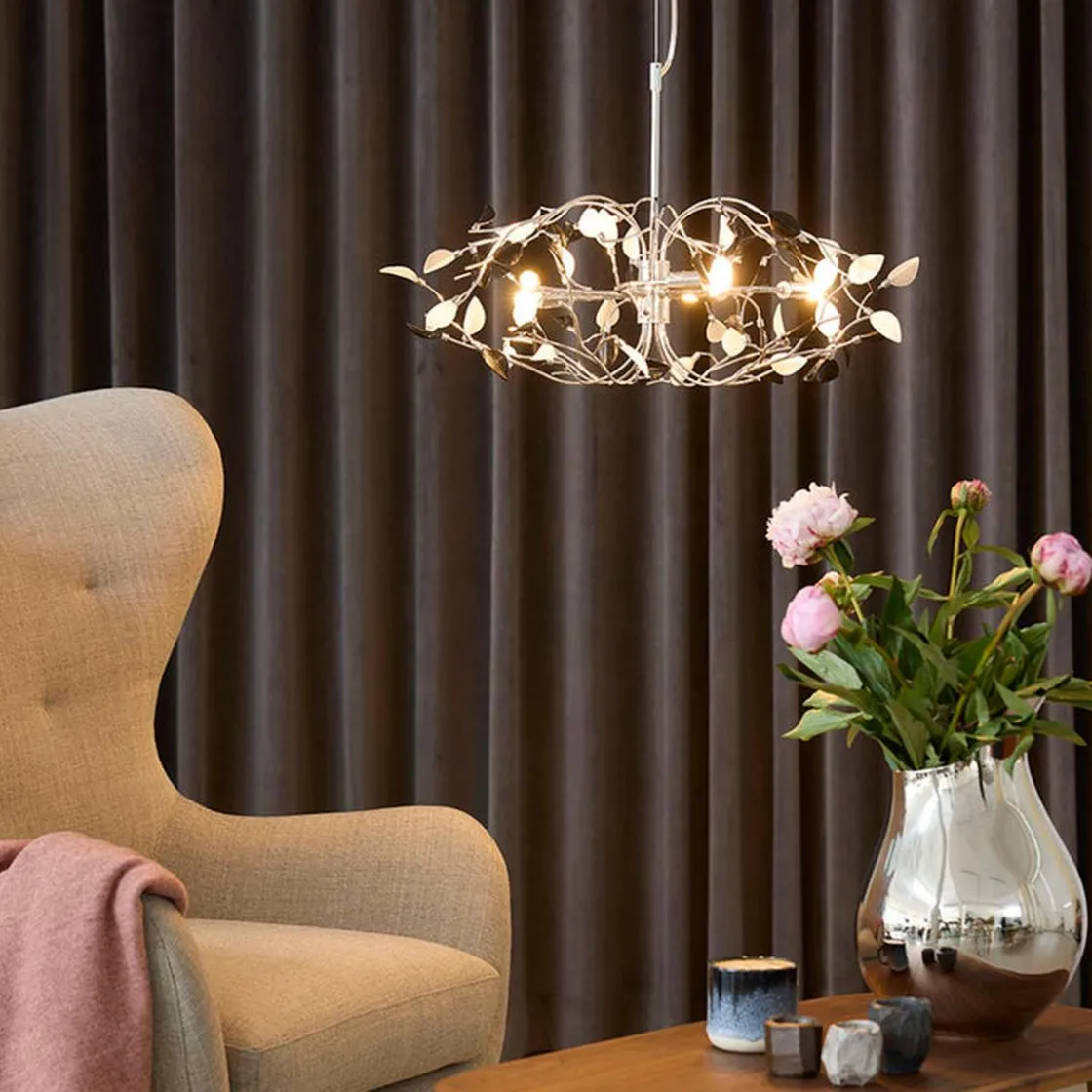 Den kromfargede rammen gir et eksklusivt utseende som passer perfekt inn i skandinaviske hjem, hvor lys og enkelhet er i fokus. Iben er ideell over spisebordet, som et stemningsskapende element i stuen eller som et imponerende blikkfang i en entré med høyt under taket.