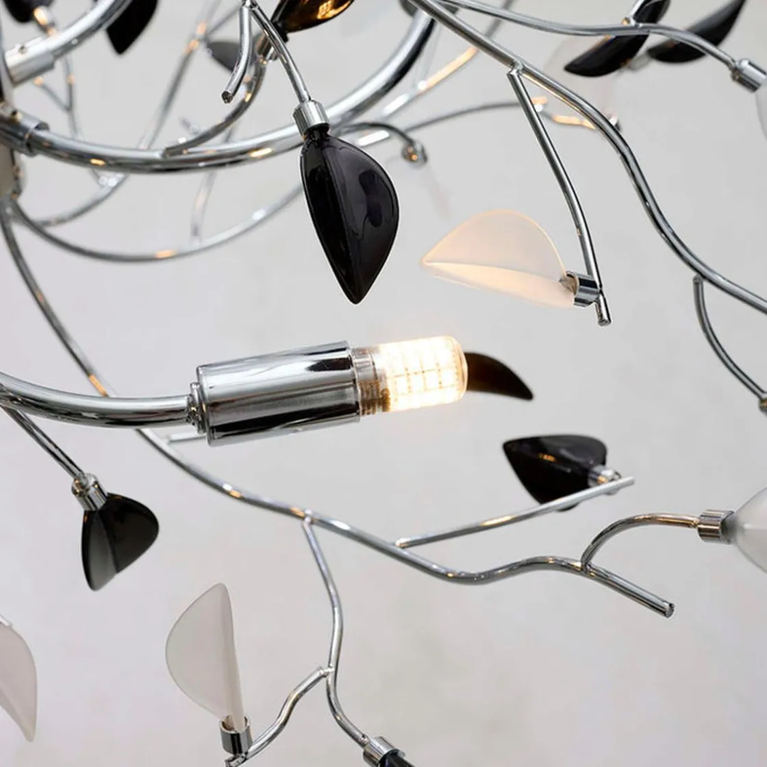 Iben-pendellampen i krom er en stilig lampe som kombinerer moderne design med klassisk eleganse. Med en diameter på 66 cm, en høyde på 35 cm og hele 74 glassblader i svart og hvitt, skaper den et unikt spill av lys og skygge. Lampen tilfører varme, hygge og personlighet til rommet, noe som gjør den til et opplagt valg for de som ønsker både funksjon og estetikk i interiørdesignet sitt.