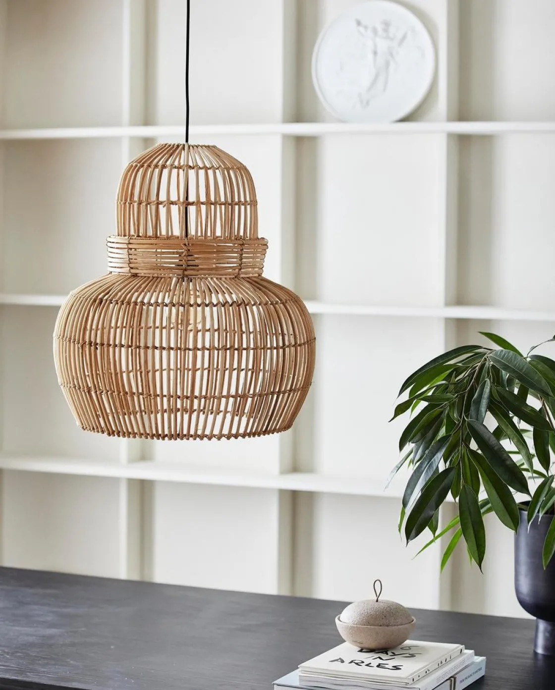 BUDVA lampeskjerm er laget av rotting med en naturlig finish. Lampens organiske form og utseende vil gi raffinement til enhver innredning. Balanserer perfekt mellom det voluminøse og det delikate, denne lampeskjermen gir rommet ditt en atmosfære av eleganse. Det tynne mønsteret skaper en sjarmerende refleksjon av lyset, noe som gjør at lampen ikke bare er praktisk
