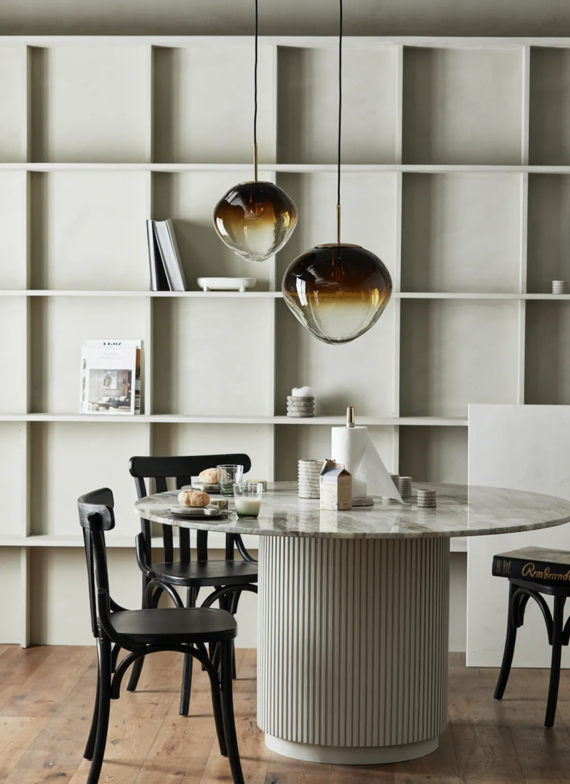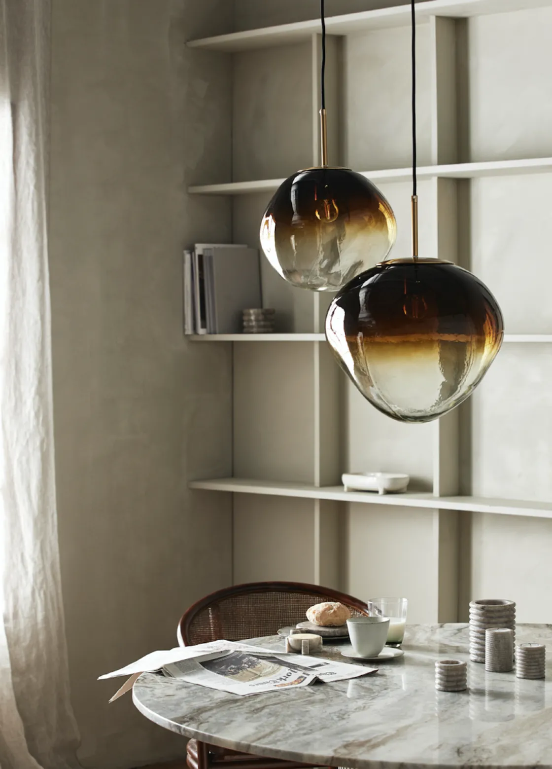 Edfu er en fantastisk vakker lampe i organisk form fra danske Nordal. Glasset er drapert i en nydelig brun tone, detaljer i messing.