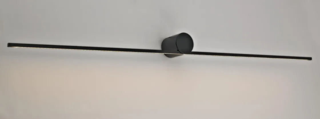 Elegant og minimalistisk lampe, som kan monteres på vegg. Lampen gir et indirekte lys nedover, og kan monteres vannrett og loddrett for å skape ulike designeffekter.