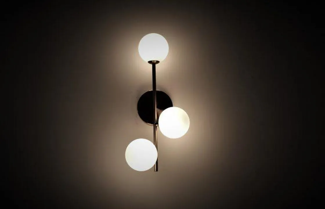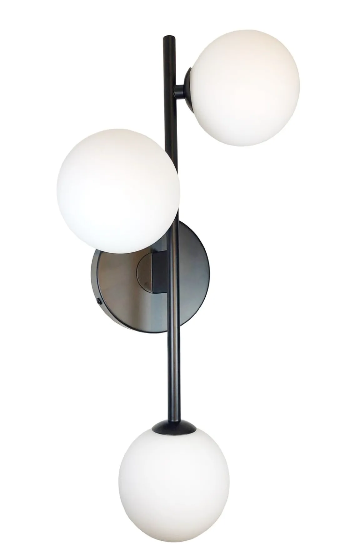 Stilren og elegant vegglampe i sort utførelse med hvite glasskupler. Lampen er 45cm lang og kan monteres vann- og loddrett på vegg, men kan også benyttes som en taklampe.