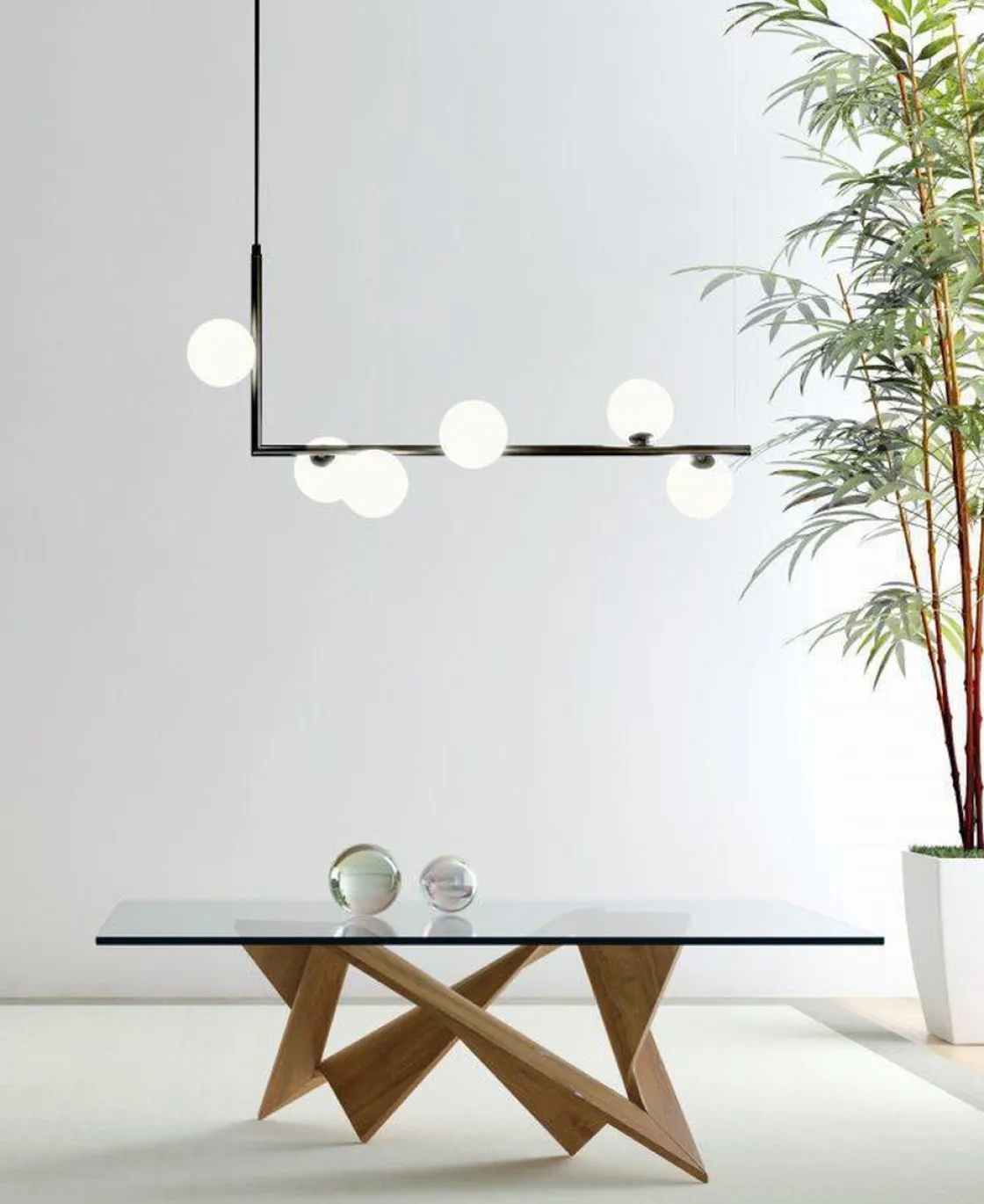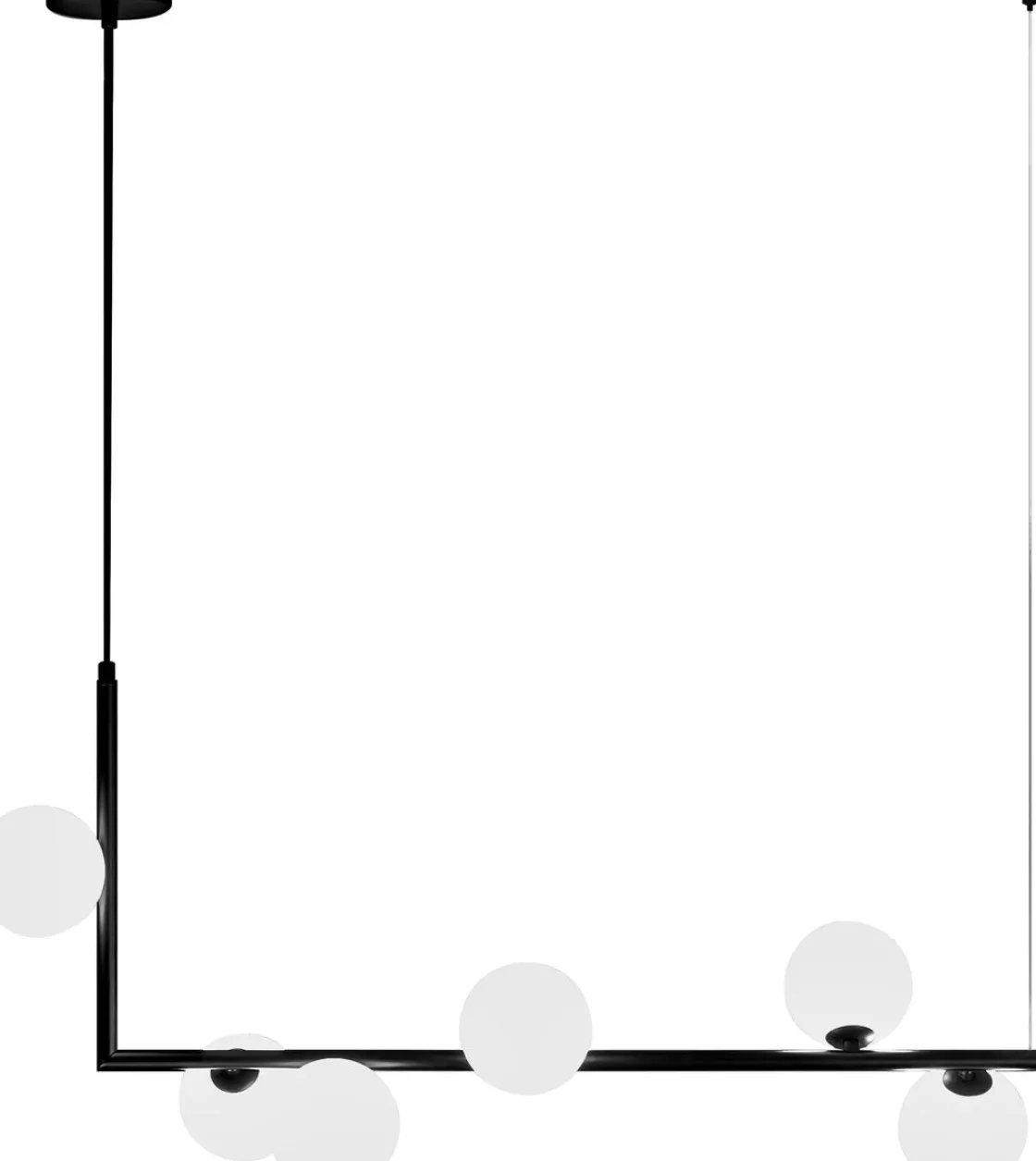 Emrik G9 er en stilig pendel i avlangt design med sort utførelse og med hvite glasskupler. Glasskuplene lyser perfekt og gir et vakkert design. Dimbar avhengig av valgt lyskilde (G9).