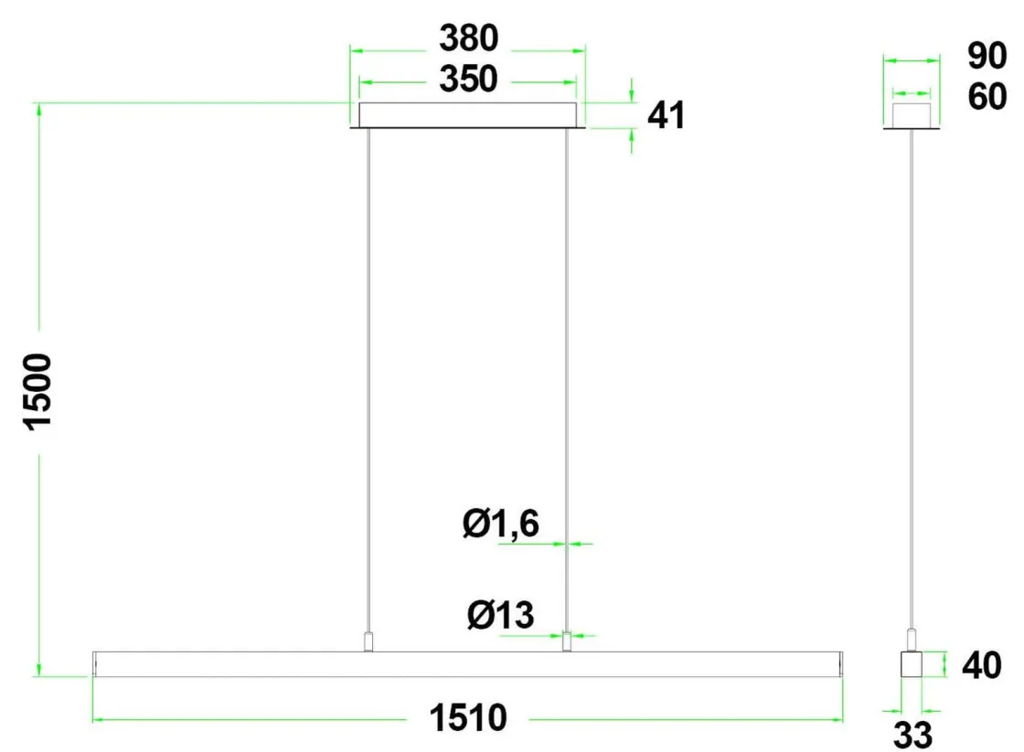 - Lengde ledning: 150 cm fra takfeste ned til pendel