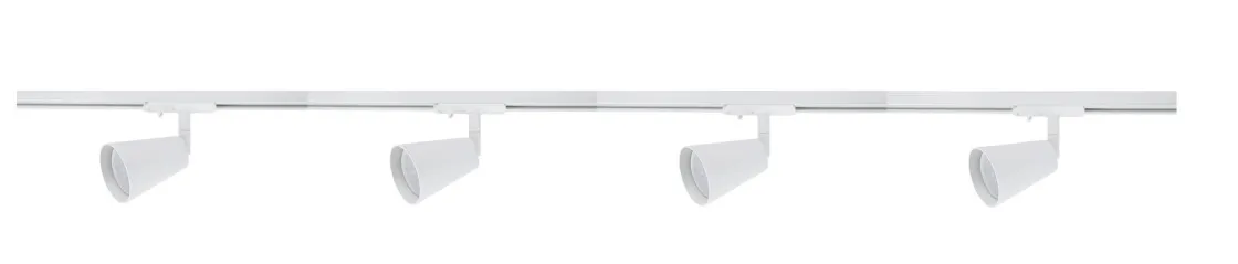 Komplett 2 meter spotskinne med 4 spotter. Lyspærer kjøpes separat med GU10 sokkel.