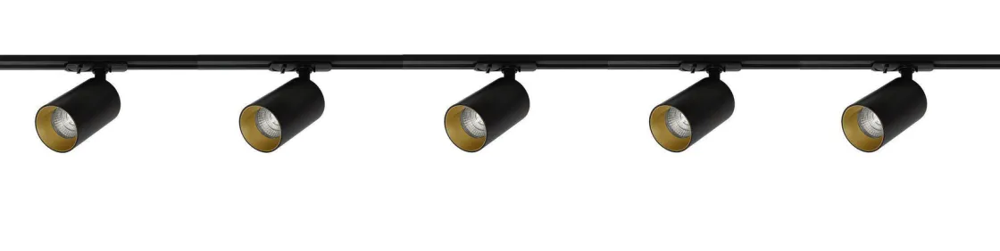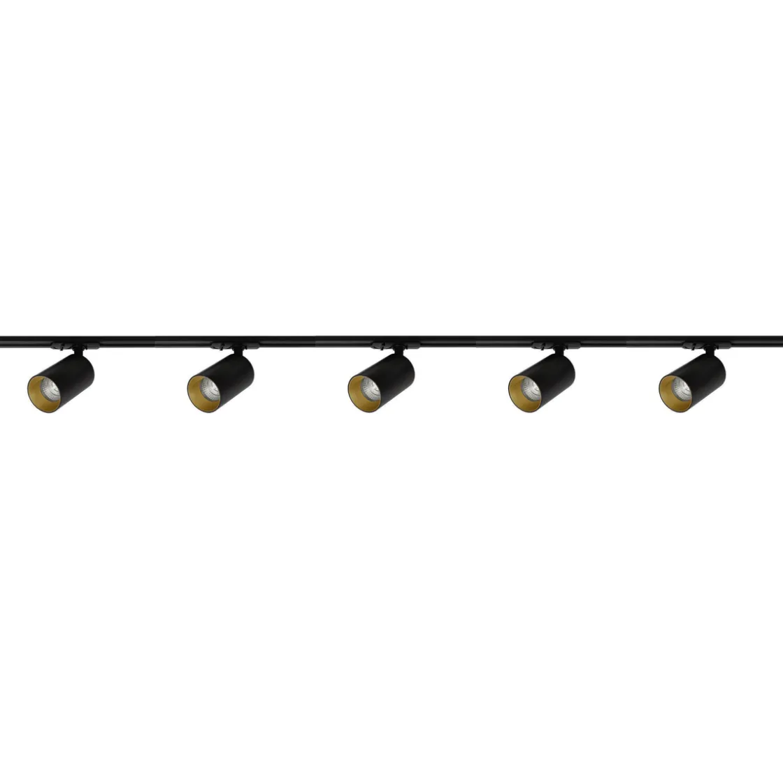 Komplett 2 meter spotskinne med 5 spotter. Lyspærer kjøpes separat med GU10 sokkel.