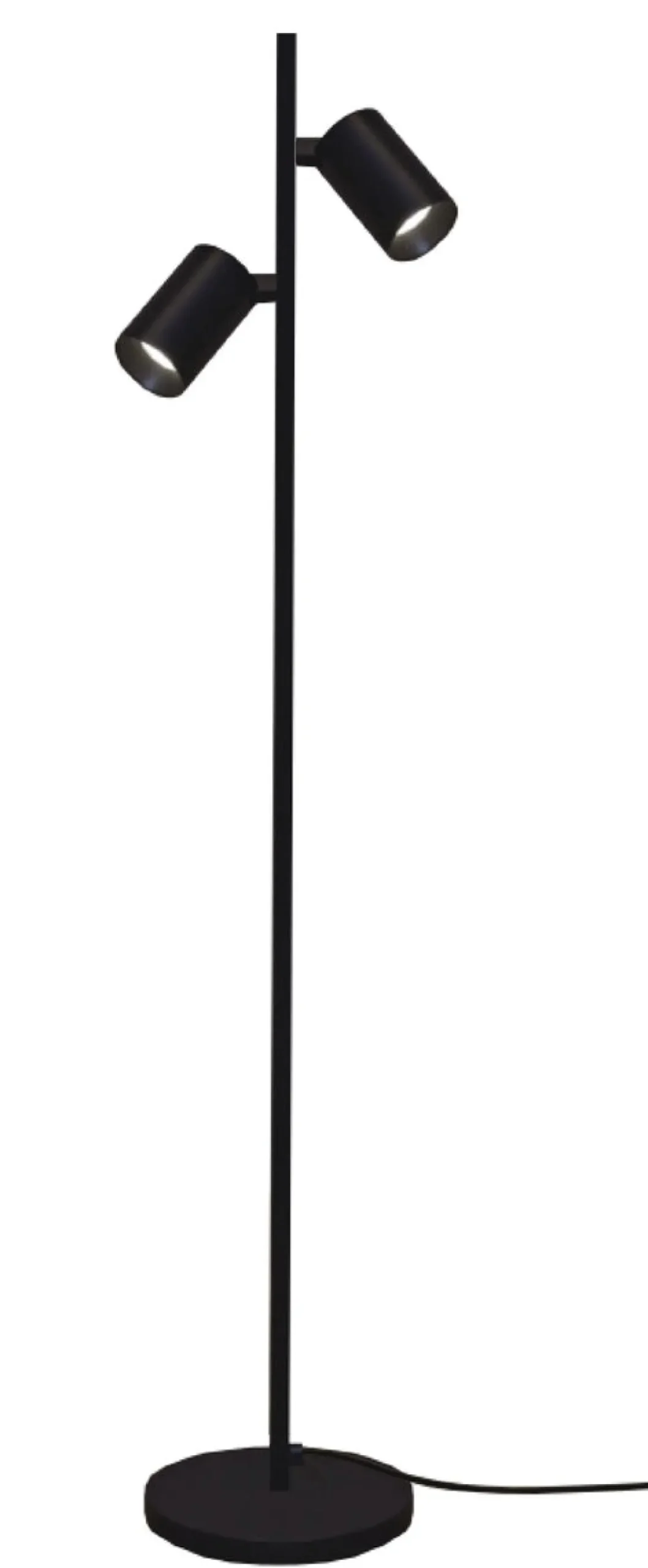 Delikat gulvlampe med to lampehoder som er tilt- og roterbare. Lampen er 150cm høy og har 200cm ledning. Hvert lampehode er utstyrt med av/på-bryter, og lampen benytter GU10-lyskilder. Lampehodet trekkes enkelt av for montering av lyskilde.