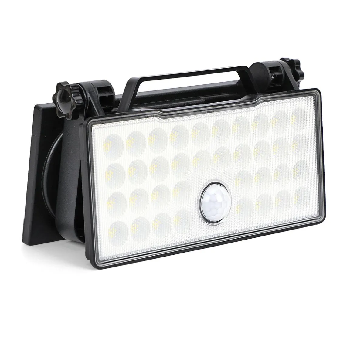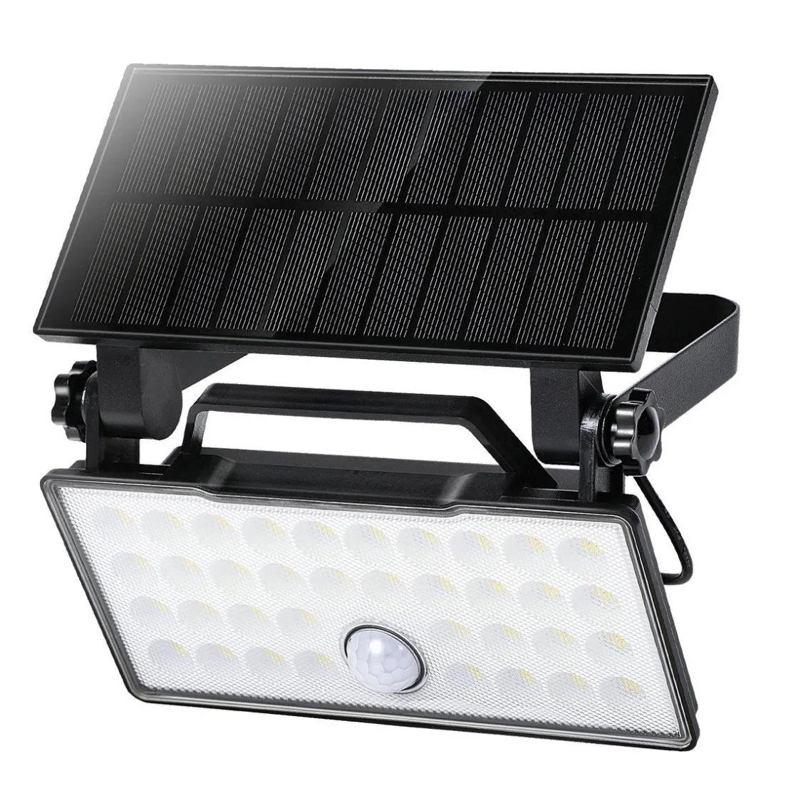 Oppladbar lampe med solcelle og bevegelsessensor. Lyset kan tiltes og solcellepanelet er justerbart. Kan monteres fast til vegg, men også bæres med seg, og benyttes som et frittstående lys.