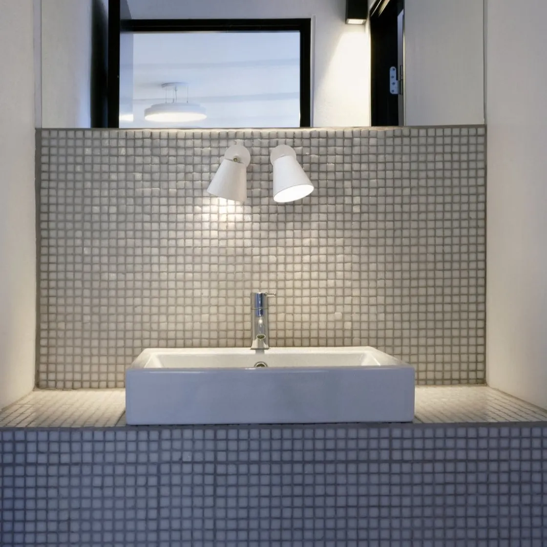 IP S6 er en moderne og stilren vegglampe som passer perfekt for montering ved siden av eller over speilet på badet. Lampehodet kan dreies til begge sider og vippes opp og ned. Design av Bønnelycke mdd.