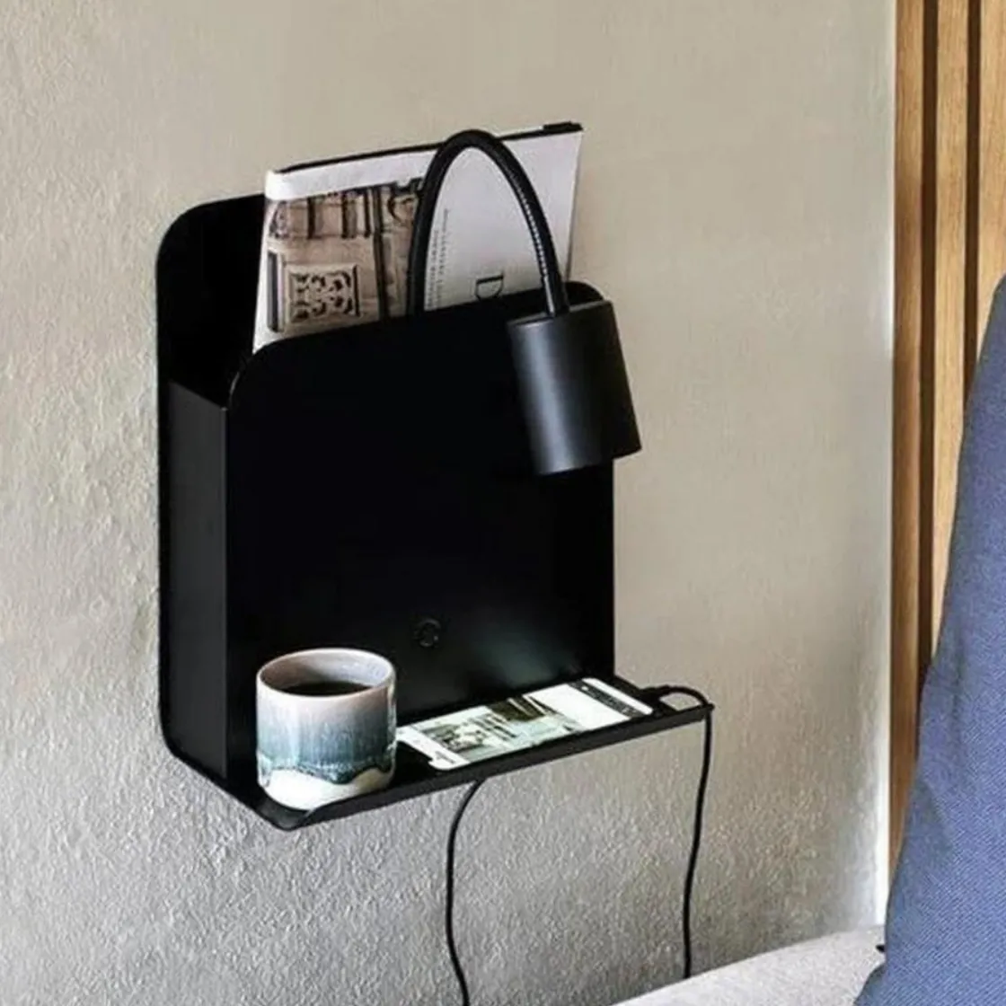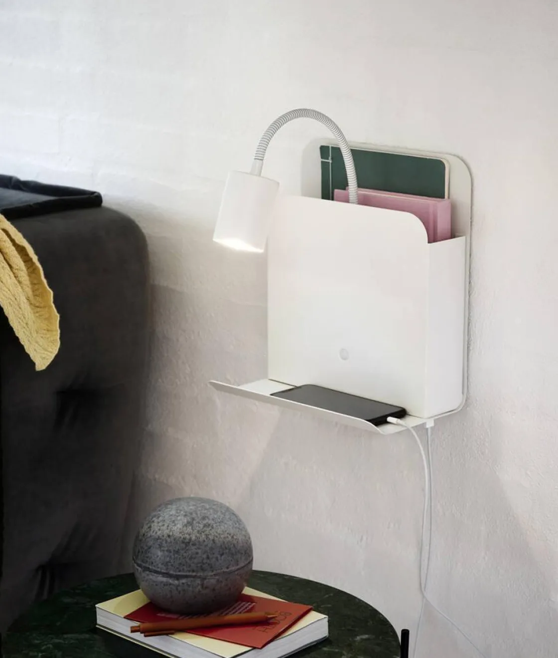 Roomi-vegglampen er både funksjonelt lys, et rom og en praktisk hylle som kan lagre dine viktigste nødvendigheter. Lampehodet kan enkelt justeres for retningsbestemt lys, og du kan lade smarttelefonen eller en annen enhet med den innebygde USB-porten plassert under hyllen. Perfekt ved siden av sengen eller i gangen til å holde orden på telefon og nøkler.