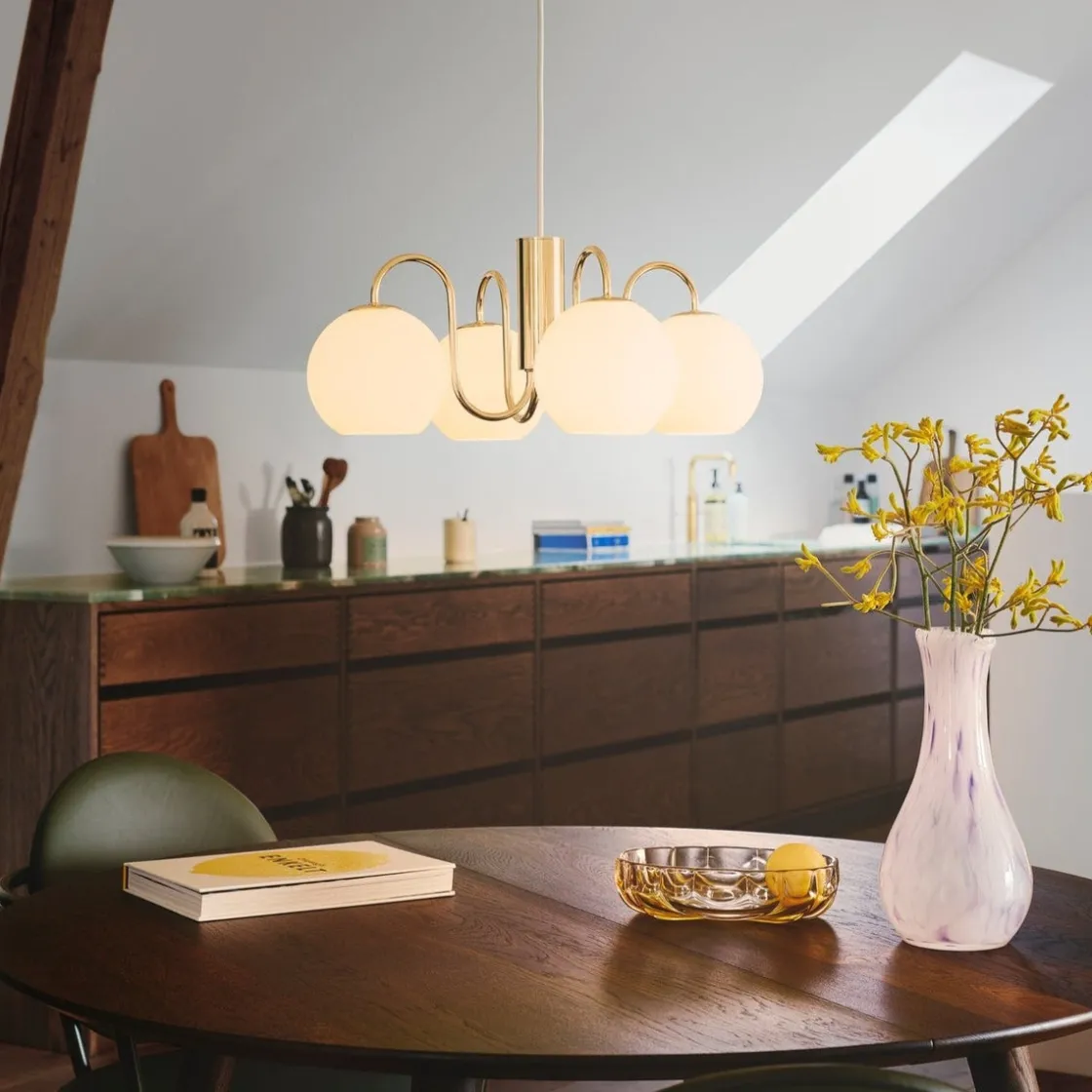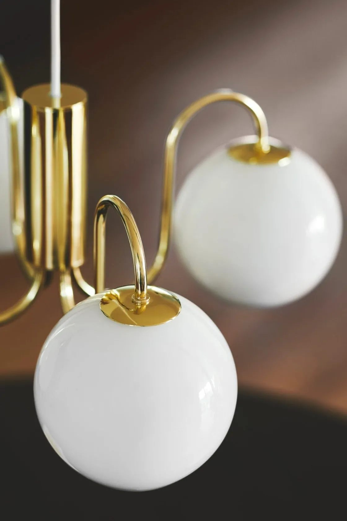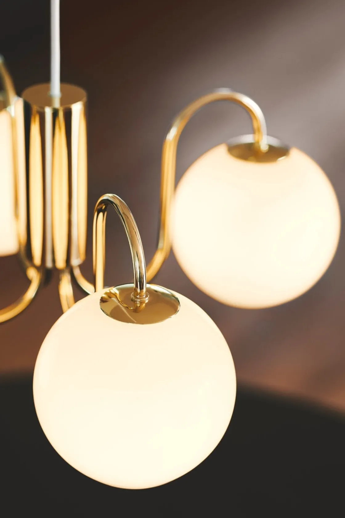 Franca-serien har et eksklusivt og elegant design med vakkert blankt glass og skinnende messing. Pendellampen henter inspirasjon fra den klassiske lysekronen og har vintagedetaljer med en moderne vri. De hvite glasskuplene skaper et mykt og diffust lys.