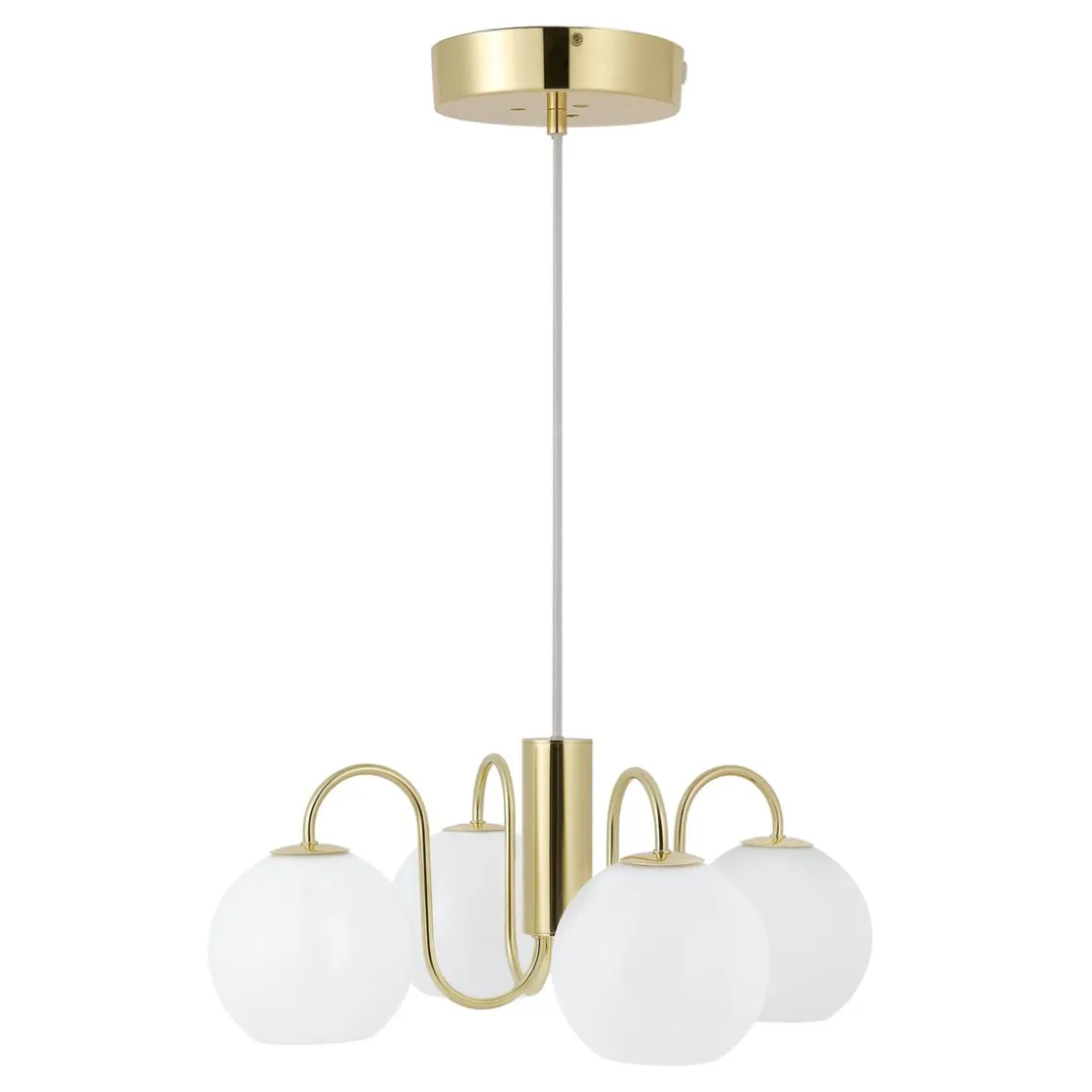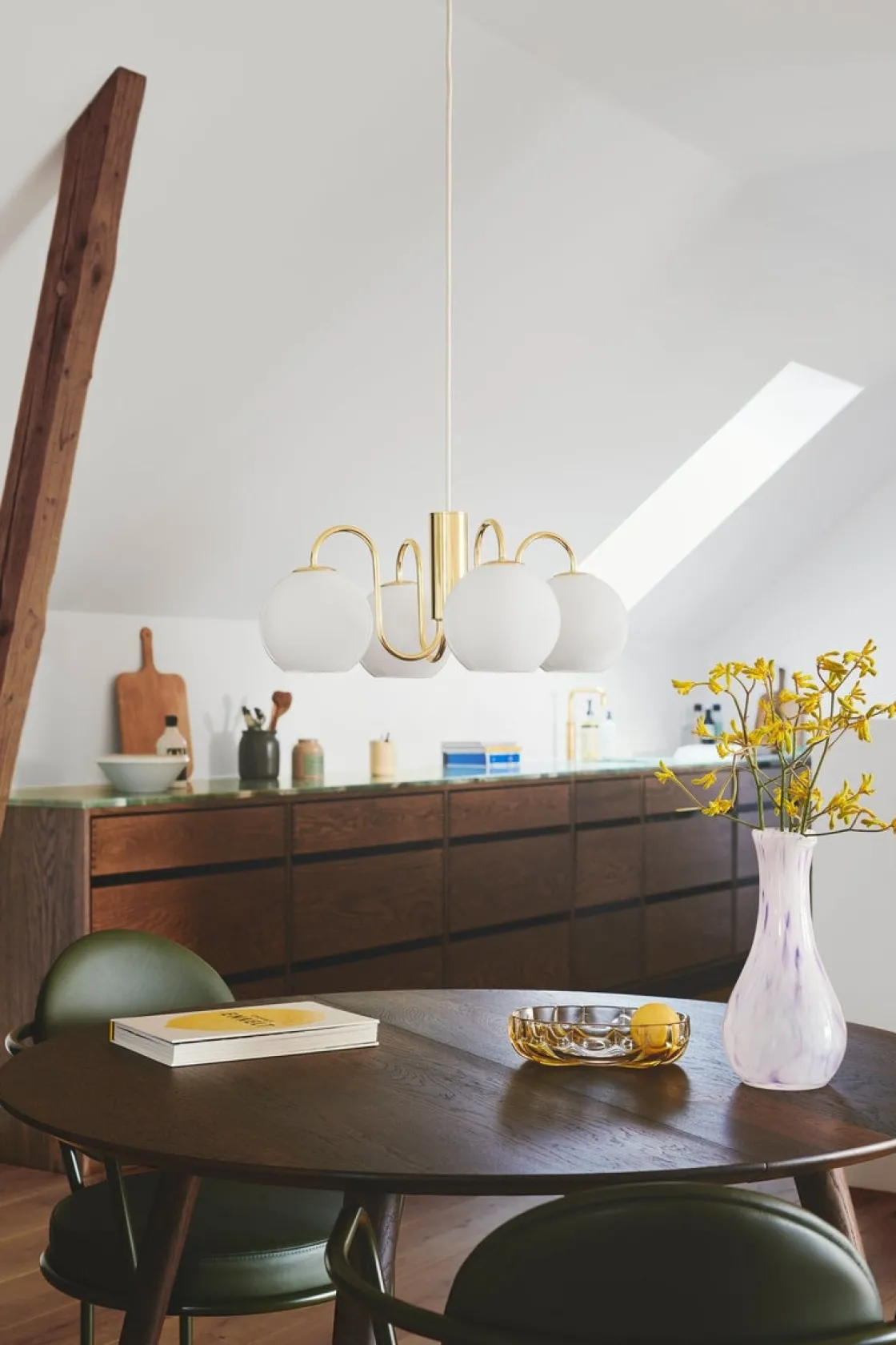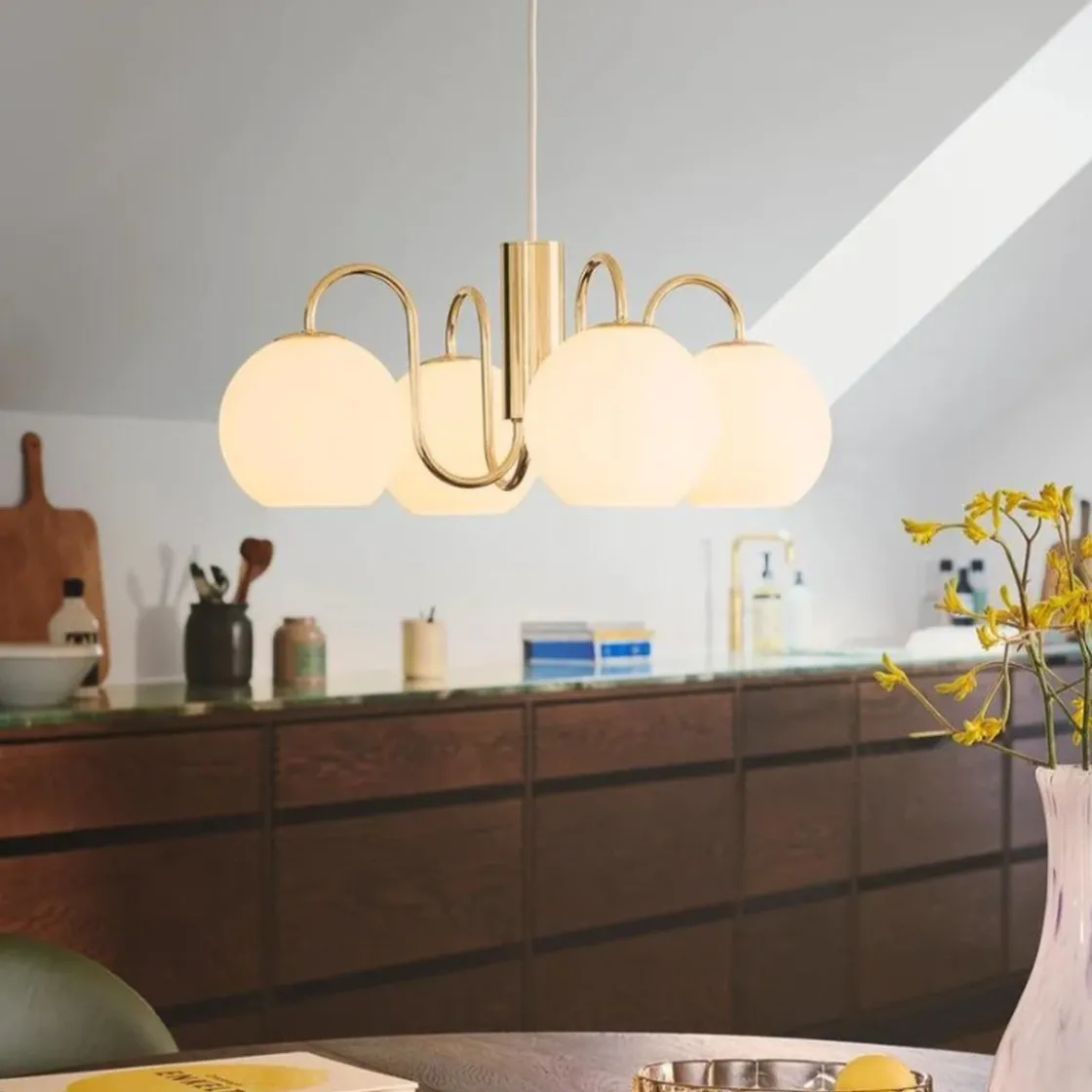 Franca-serien har et eksklusivt og elegant design med vakkert blankt glass og skinnende messing. Pendellampen henter inspirasjon fra den klassiske lysekronen og har vintagedetaljer med en moderne vri. De hvite glasskuplene skaper et mykt og diffust lys.