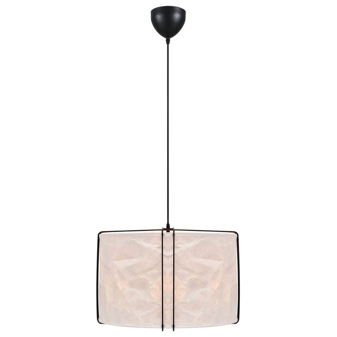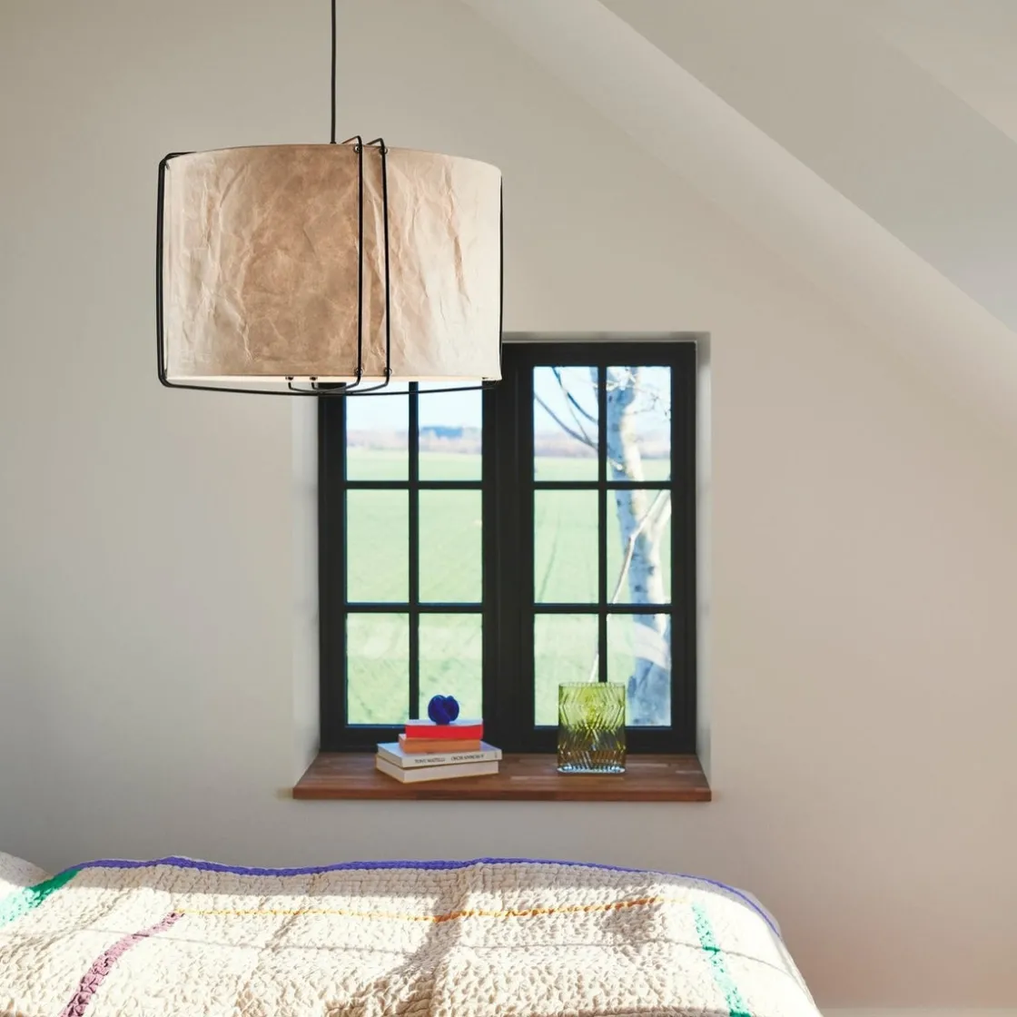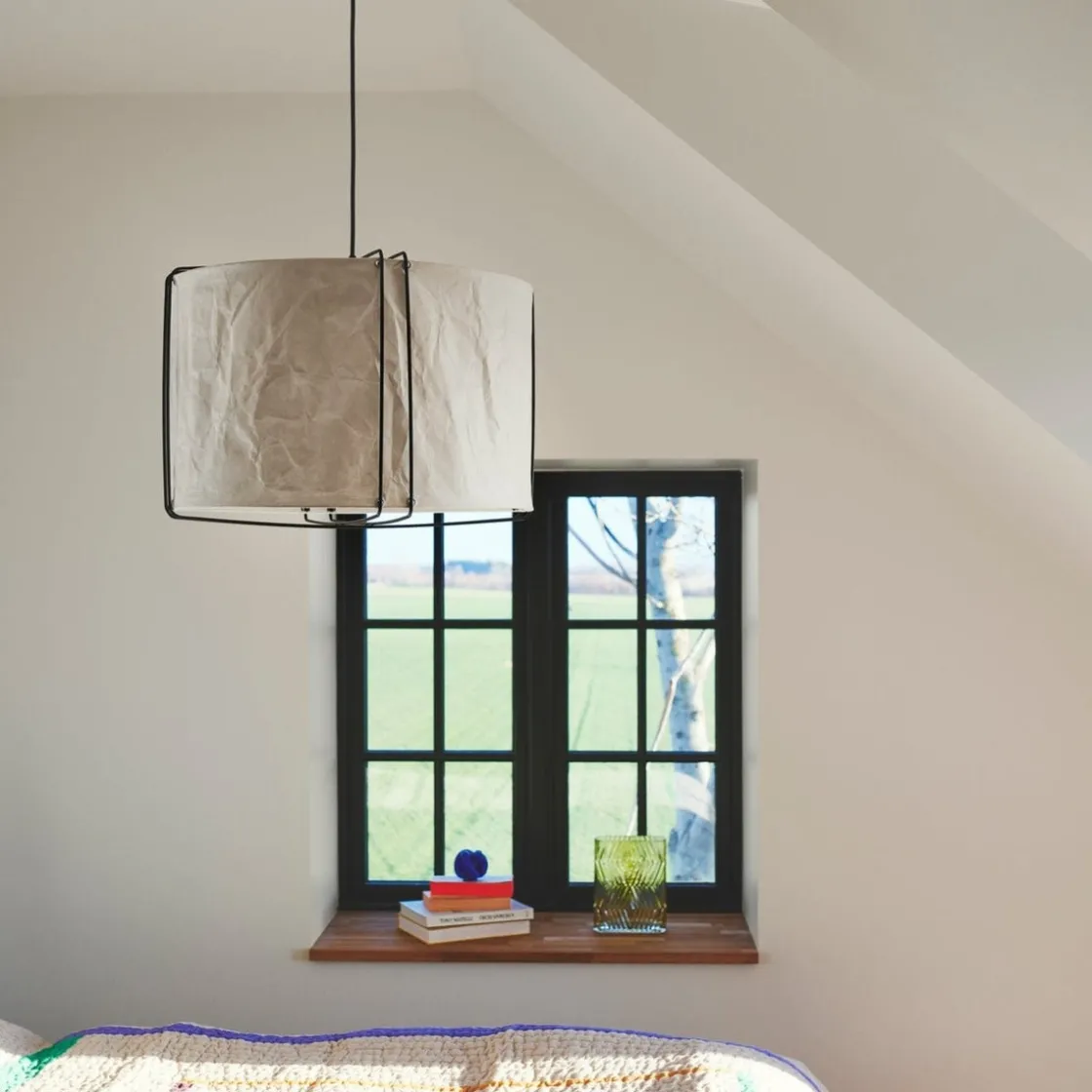 Cardine-serien har en moderne Japandi-stil som blander elementer fra den japanske interiørfilosofien med nordisk minimalisme. Den lett krøllede papirskjermen er opphengt i tynne metalltråder og sørger for et behagelig, diffust lys.
