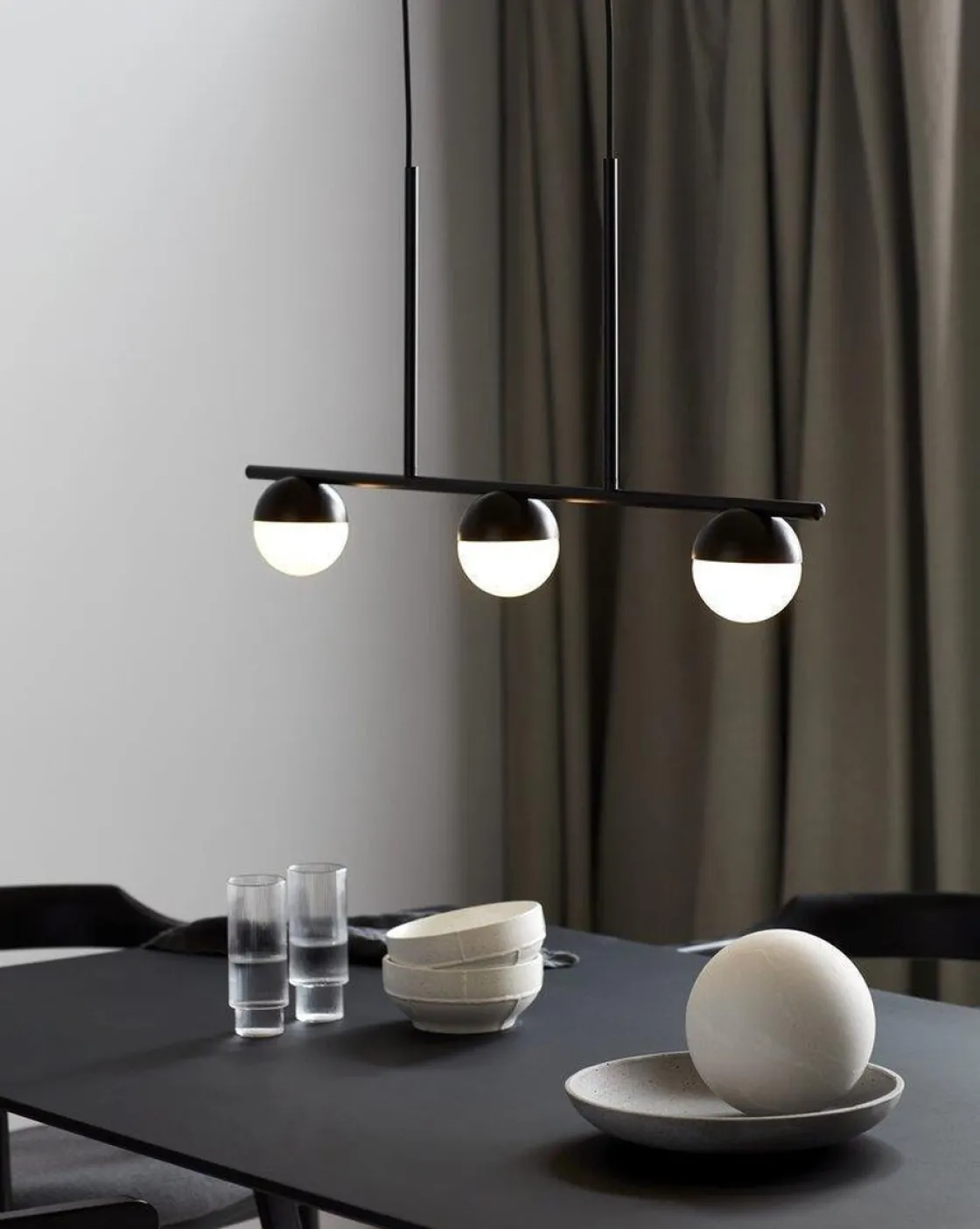 Contina er en minimalistisk langpendel med tre lyskilder i svart matt metall som er perfekt over det lange spise- eller kjøkkenbordet. Det smale designet gjør at pendelen ikke fyller i rommet eller tar utsikten.