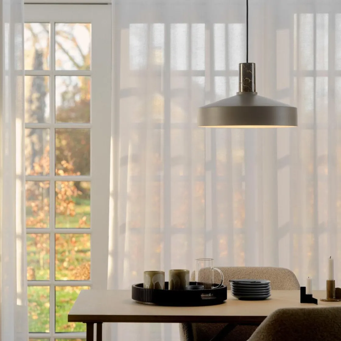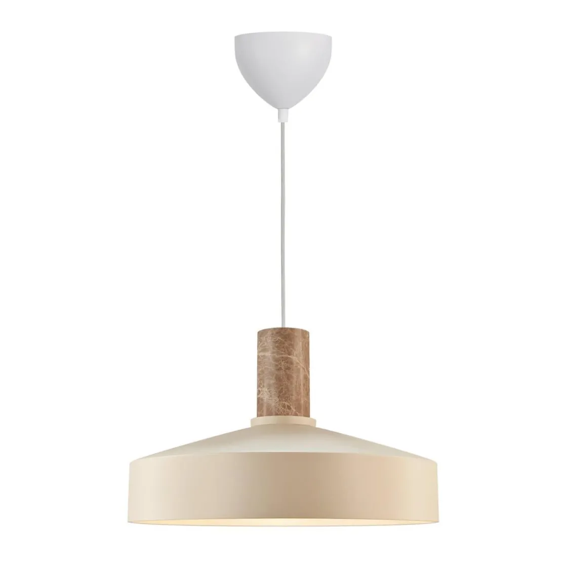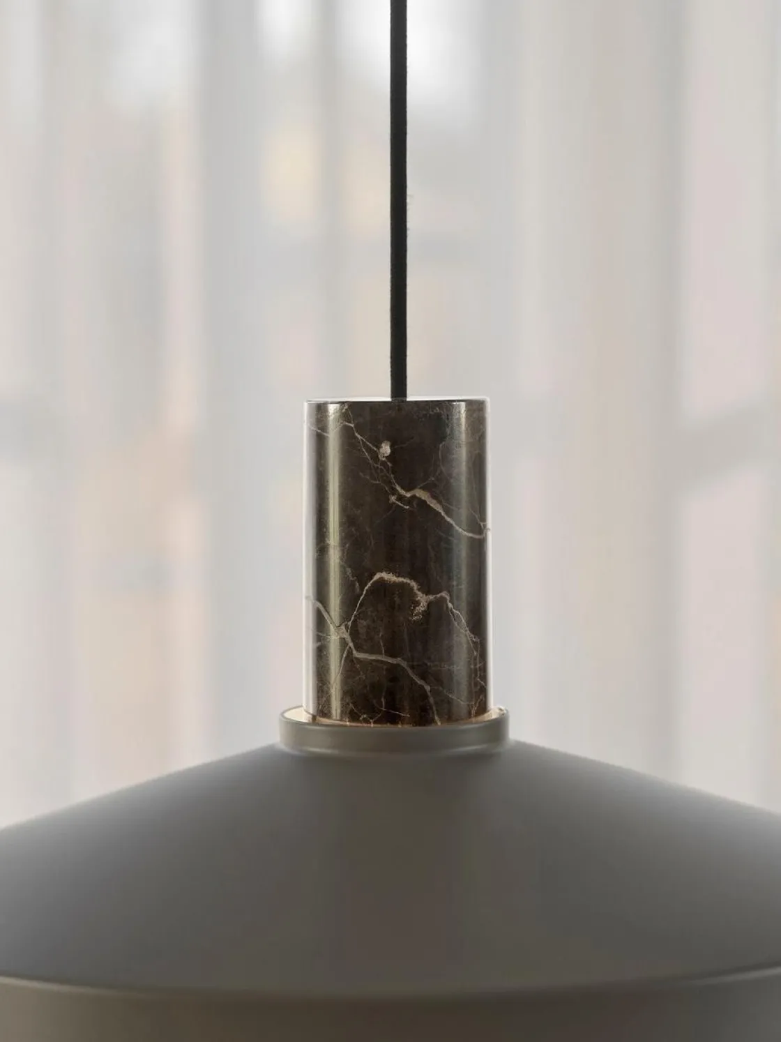 Pendelen Elvas har et moderne og minimalistisk design med en metallskjerm som komplementeres av det elegante marmoropphenget. Elvas vil henge vakkert over spisebordet eller ved siden av sofaen eller lenestolen din.