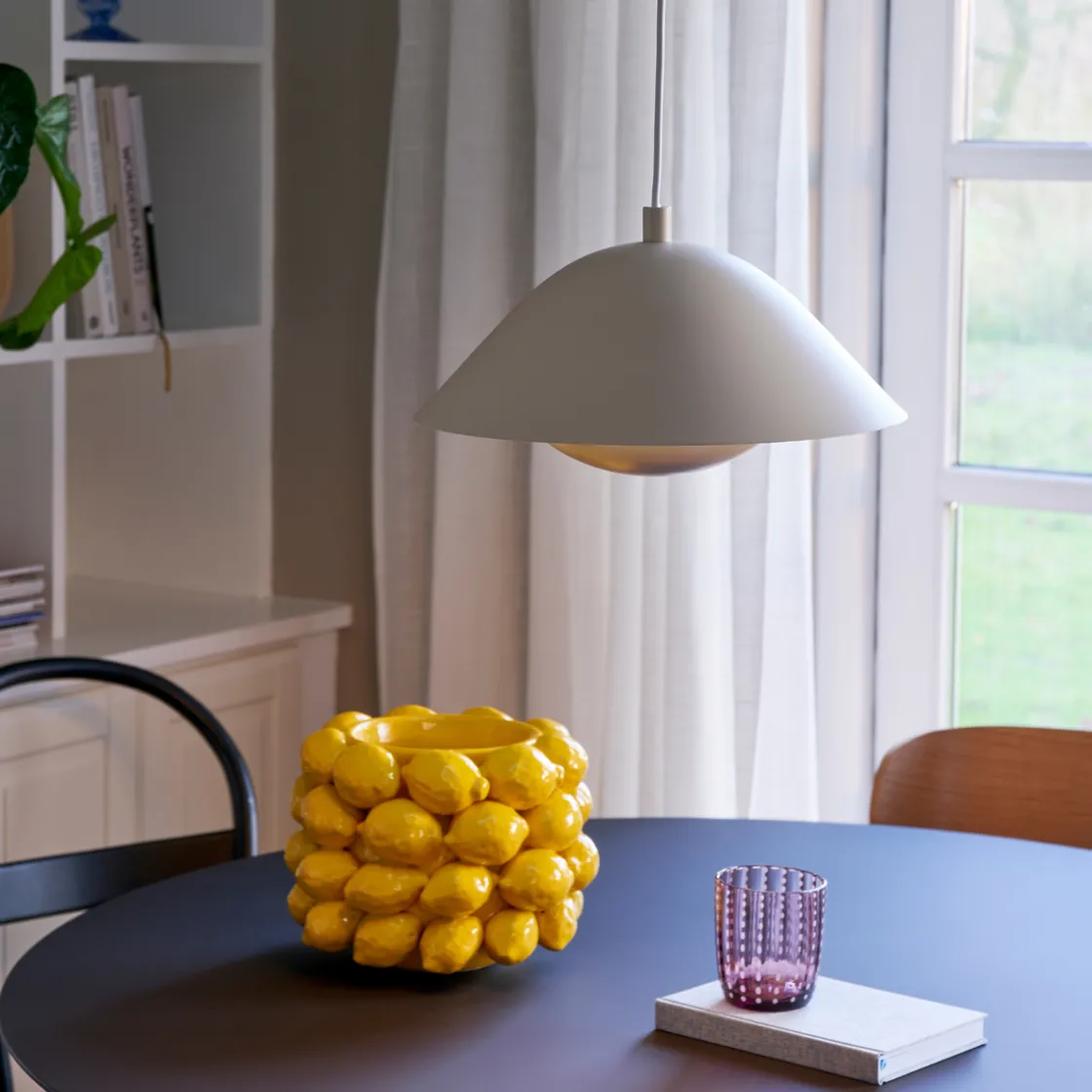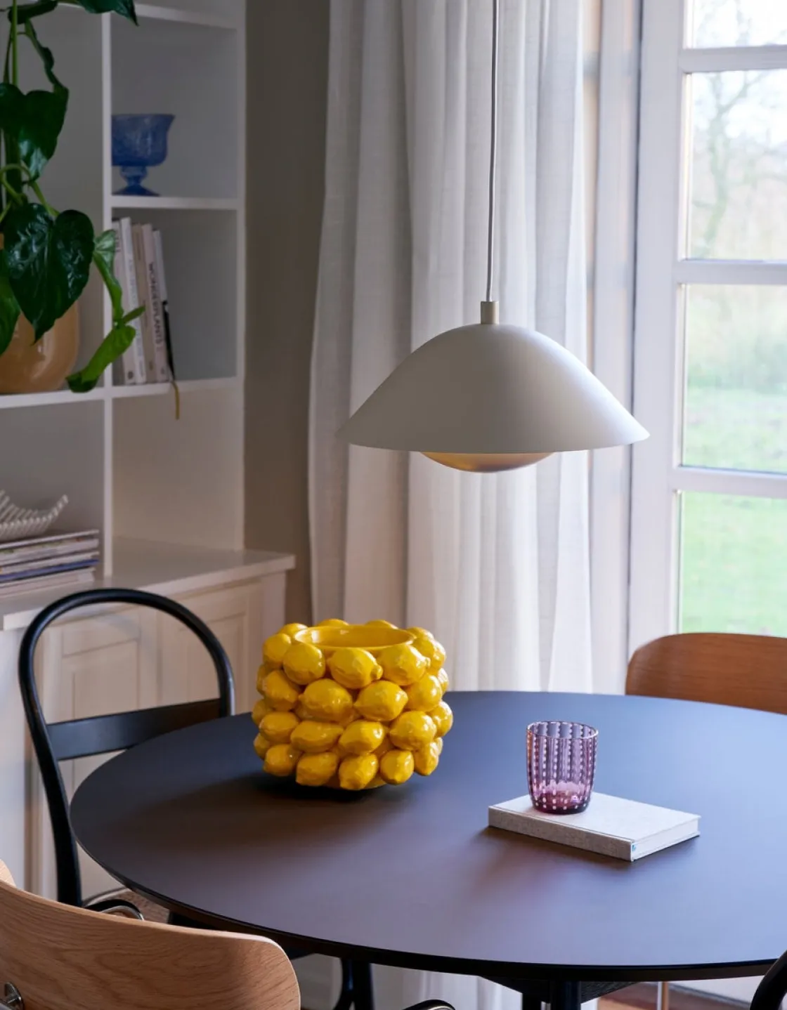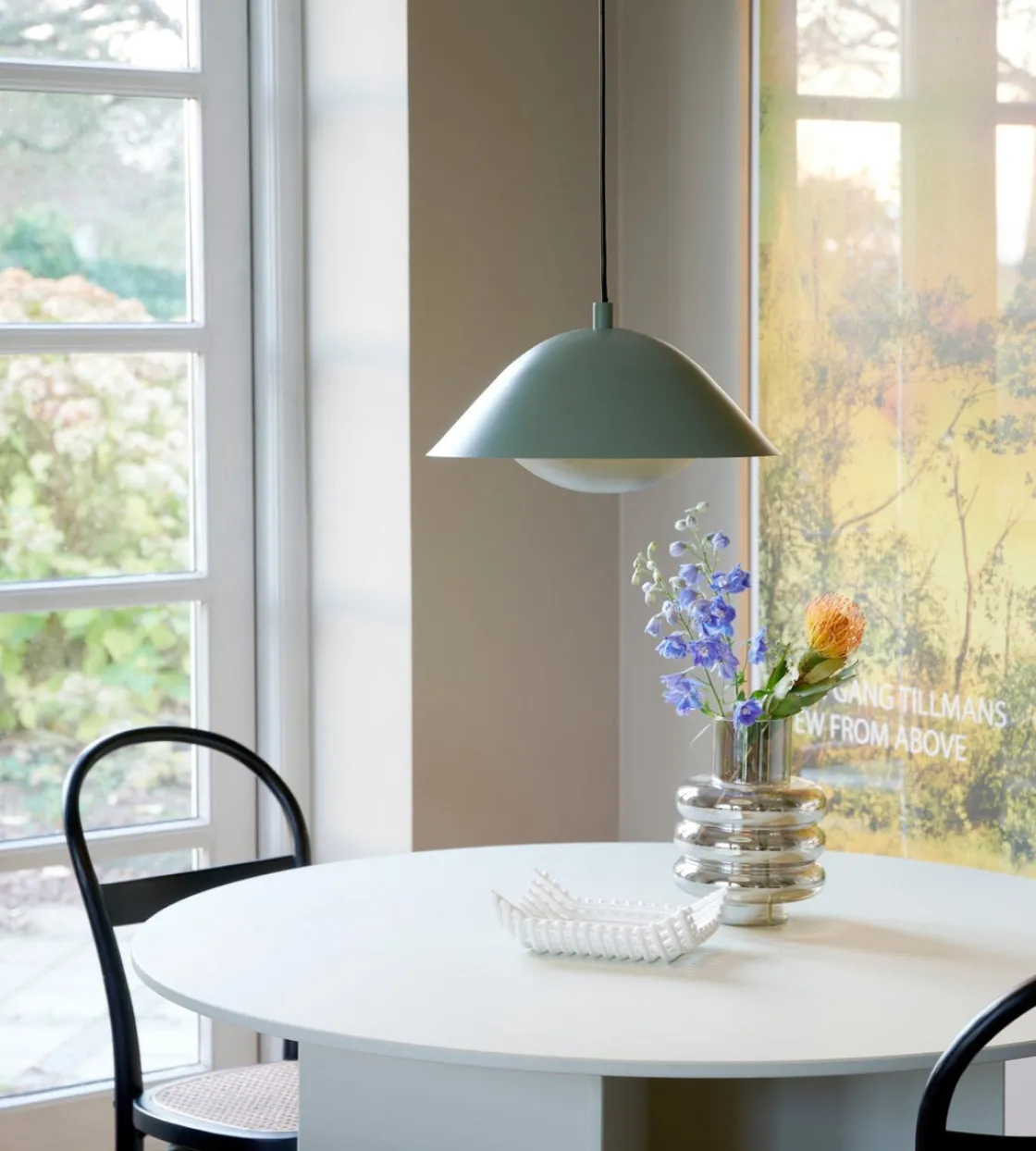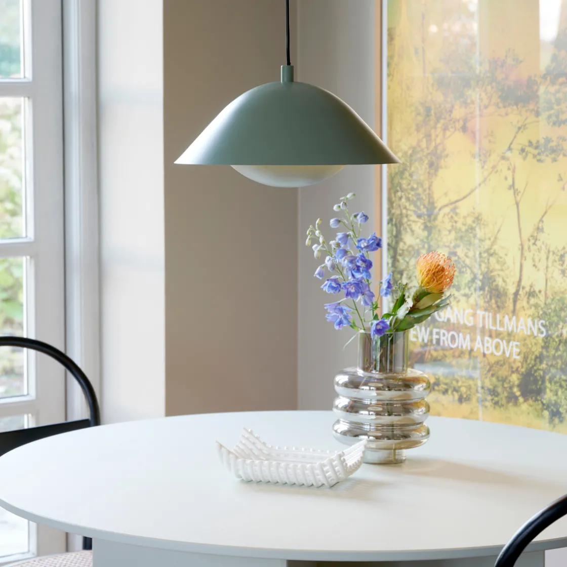 Freya er en familie av organisk formede lamper i nordisk, moderne design. Den nesten overdimensjonerte toppskjermen omfavner bunnskjermen og gjør den elegante silhuetten komplett – samtidig som den dekker lyskilden slik at lyset blir behagelig. Denne pendellampen er perfekt for å lyse opp spisebordet alene eller i et sett på to, eller til og med over kjøkkenbenken.