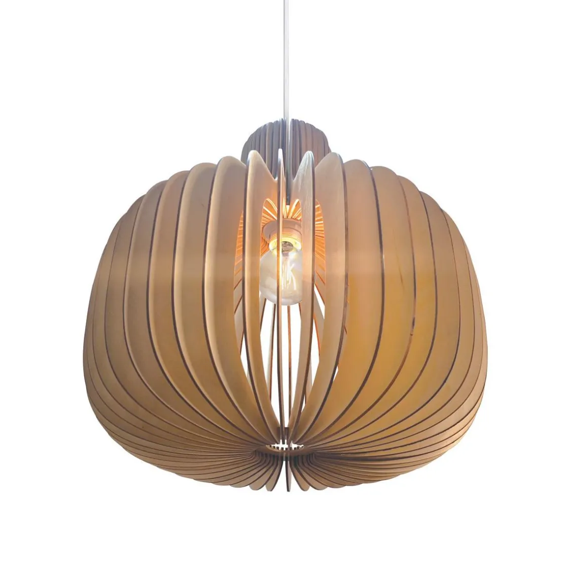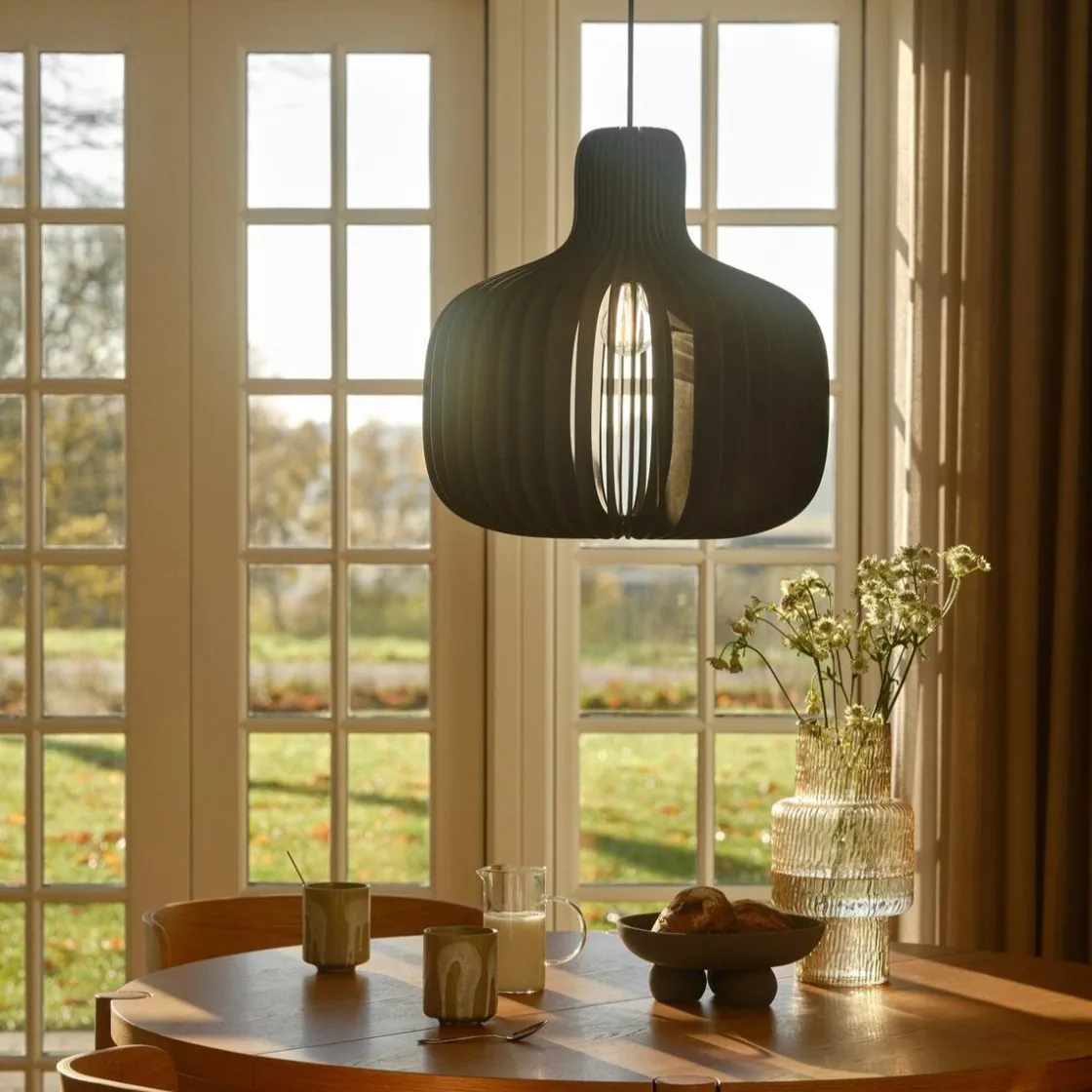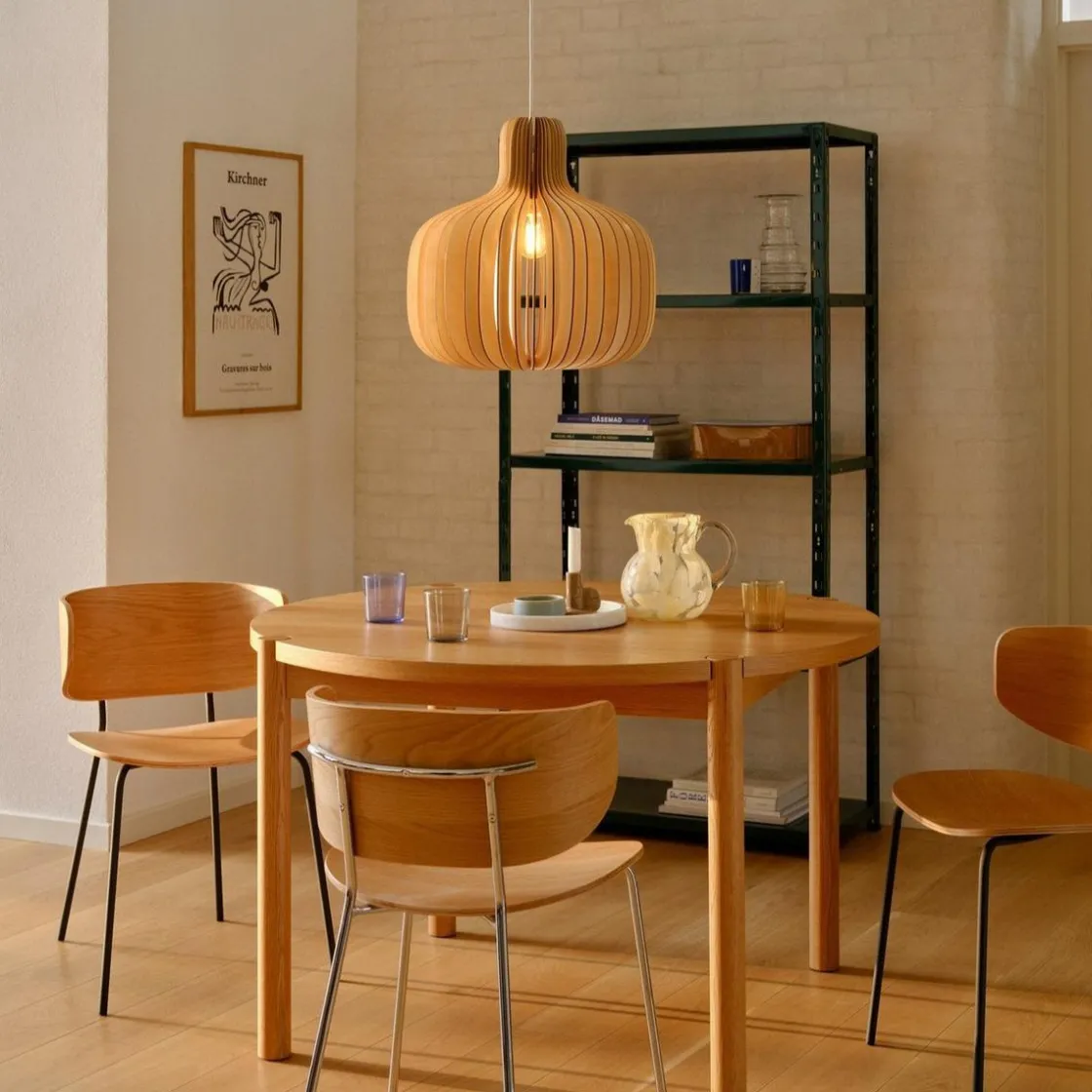 Hazo er en åpen pendel, hvor trestrukturen inviterer naturen inn og skaper et vakkert samspill mellom lys og skygge. Det luftige designet sprer lyset ut i rommet på vakreste vis. Skap ditt eget designuttrykk med en dekorativ pære