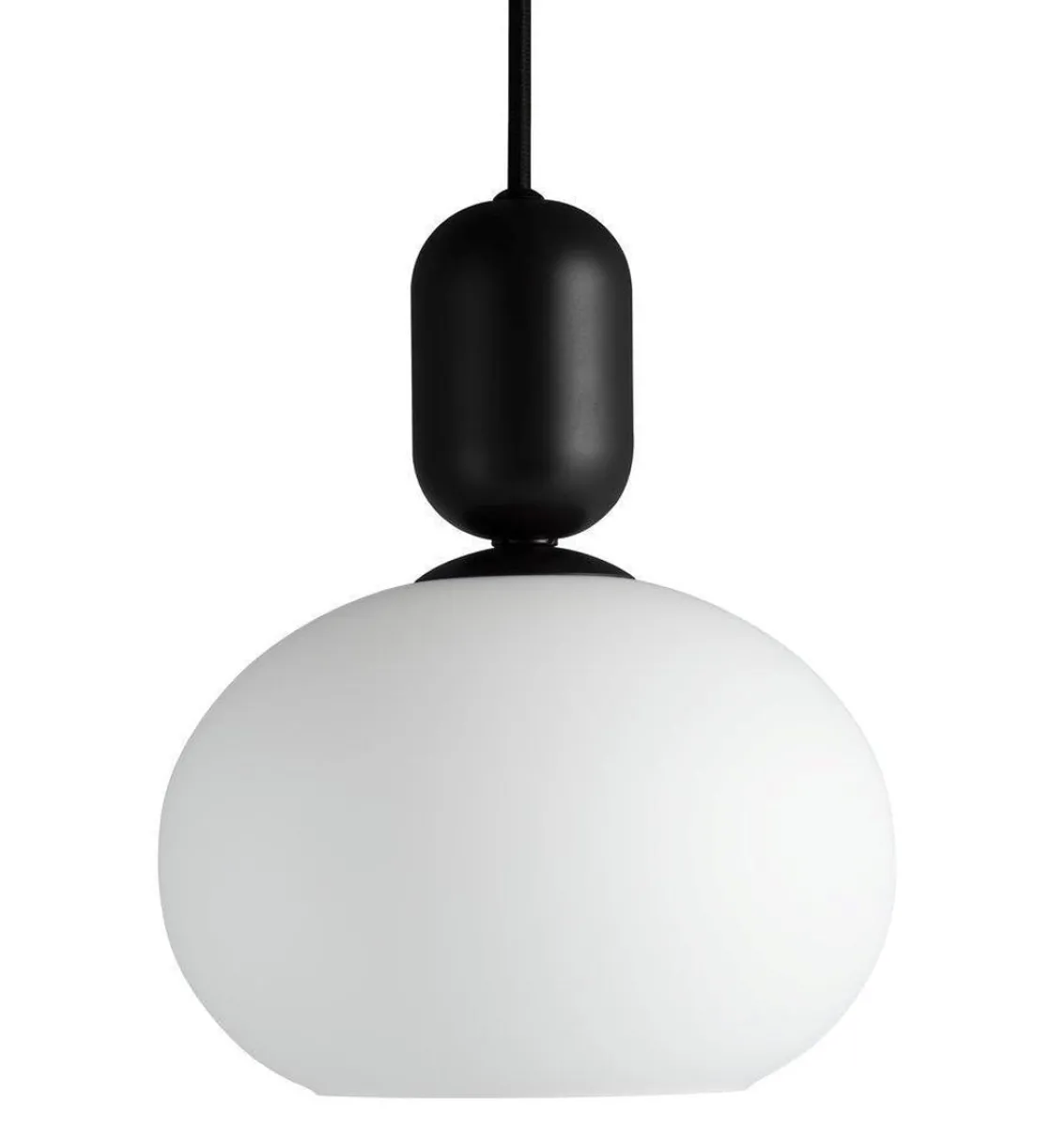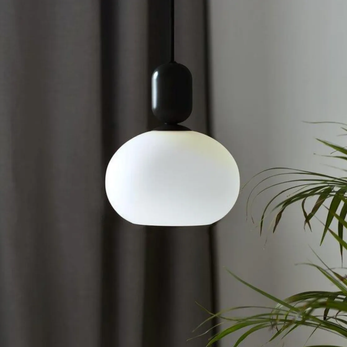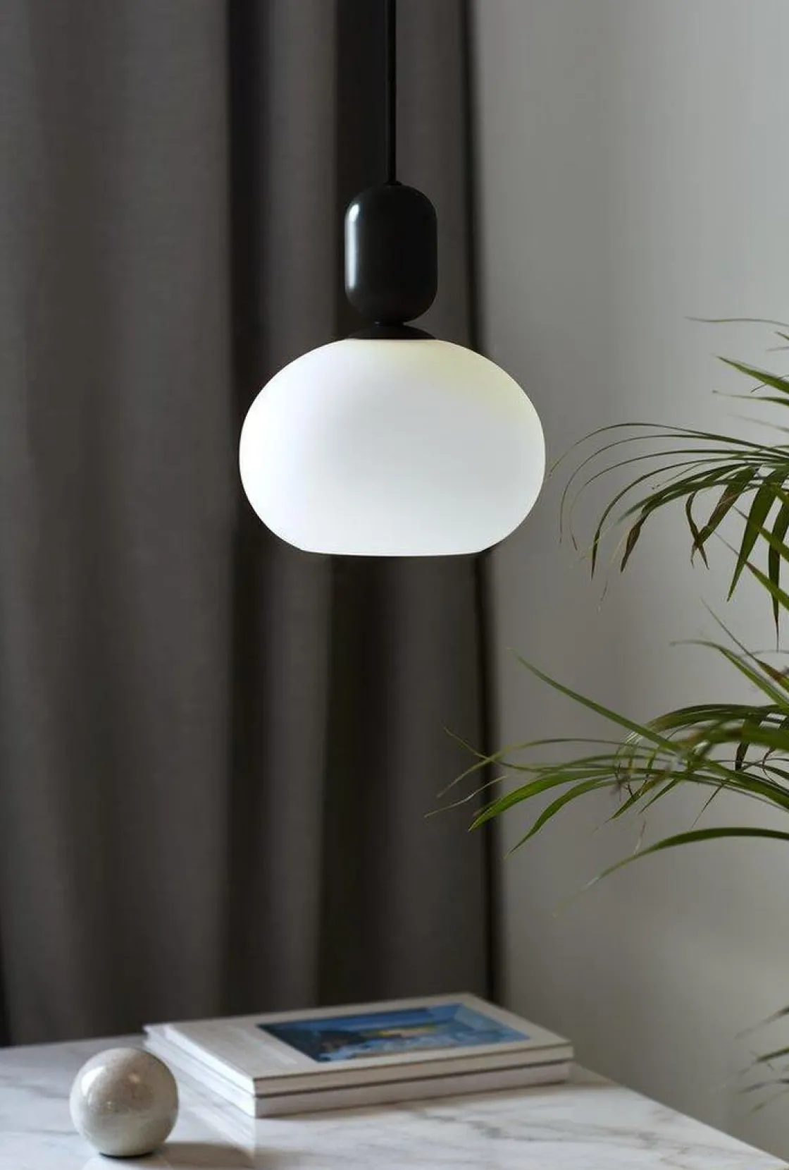 De veldreide formene resulterer i en nydelig pendel som avspeiler et elegant design. Den store kuppelformede glasskjermen i opalhvitt glass står i flott kontrast til den lette sokkelen i matt metall som bidrar til visuelt volum og et mykt lys.