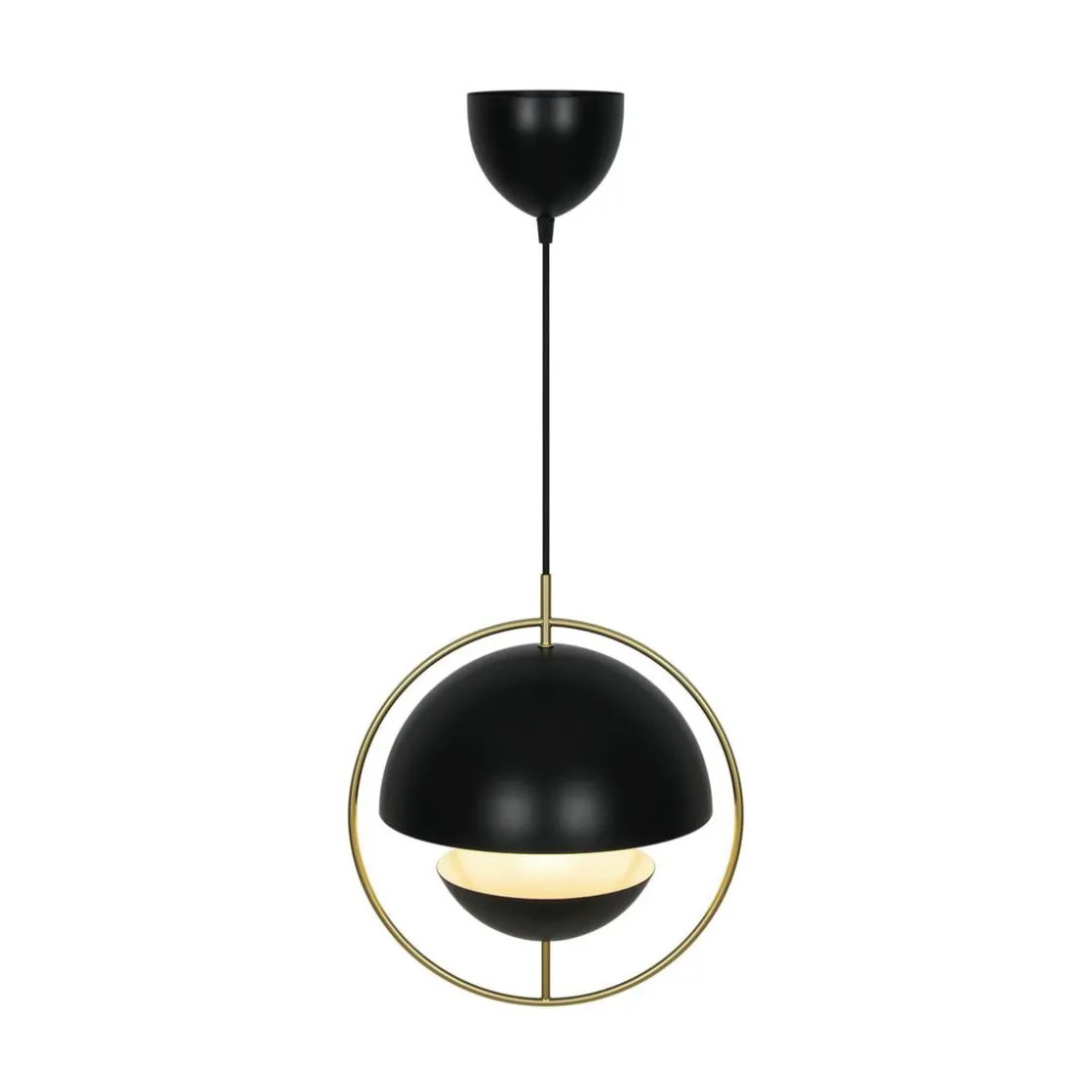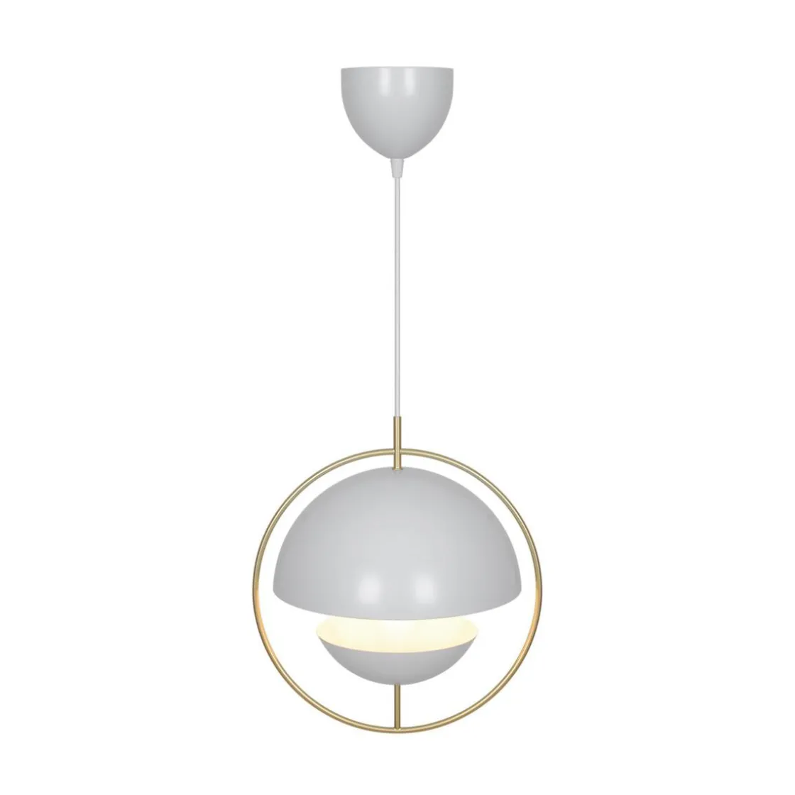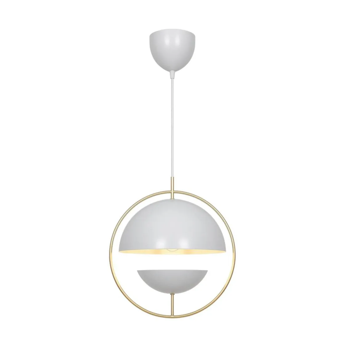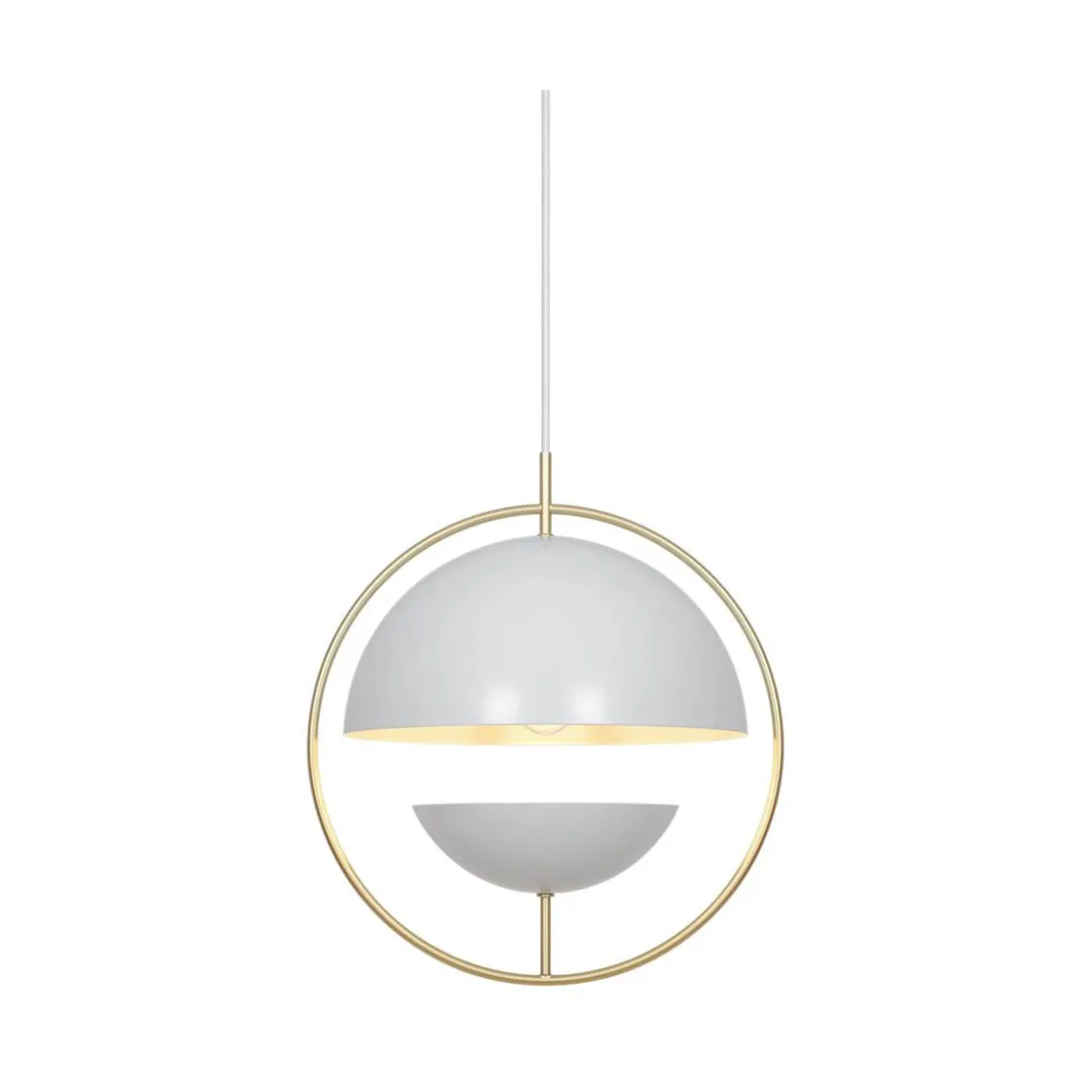Pendellampen Tavia har et dekorativt design, som kombinerer minimalisme med et glamorøst preg. De to runde skjermene er plassert overfor hverandre, omsluttet av en elegant messingring. Gir et behagelig, diffust lys.