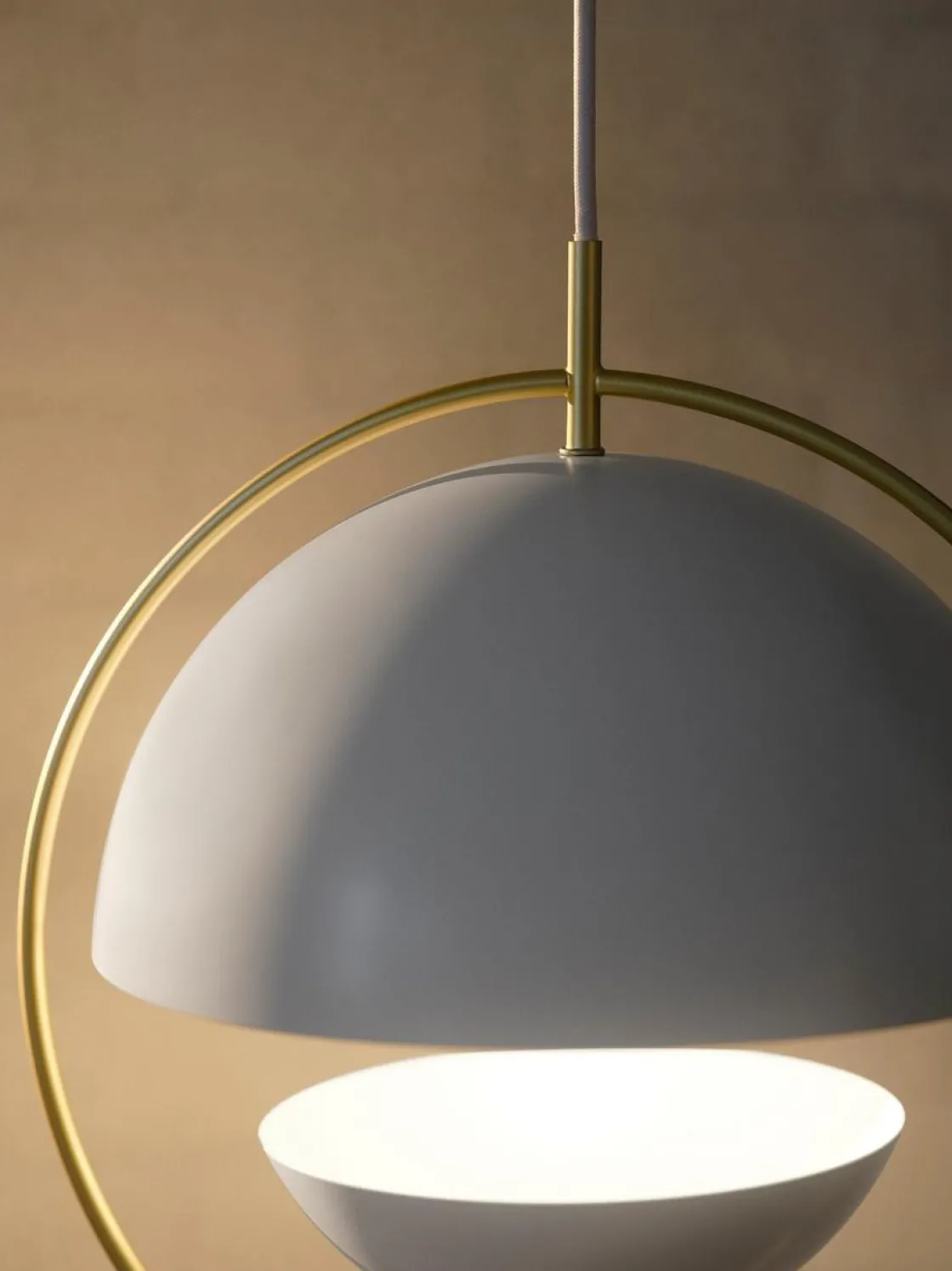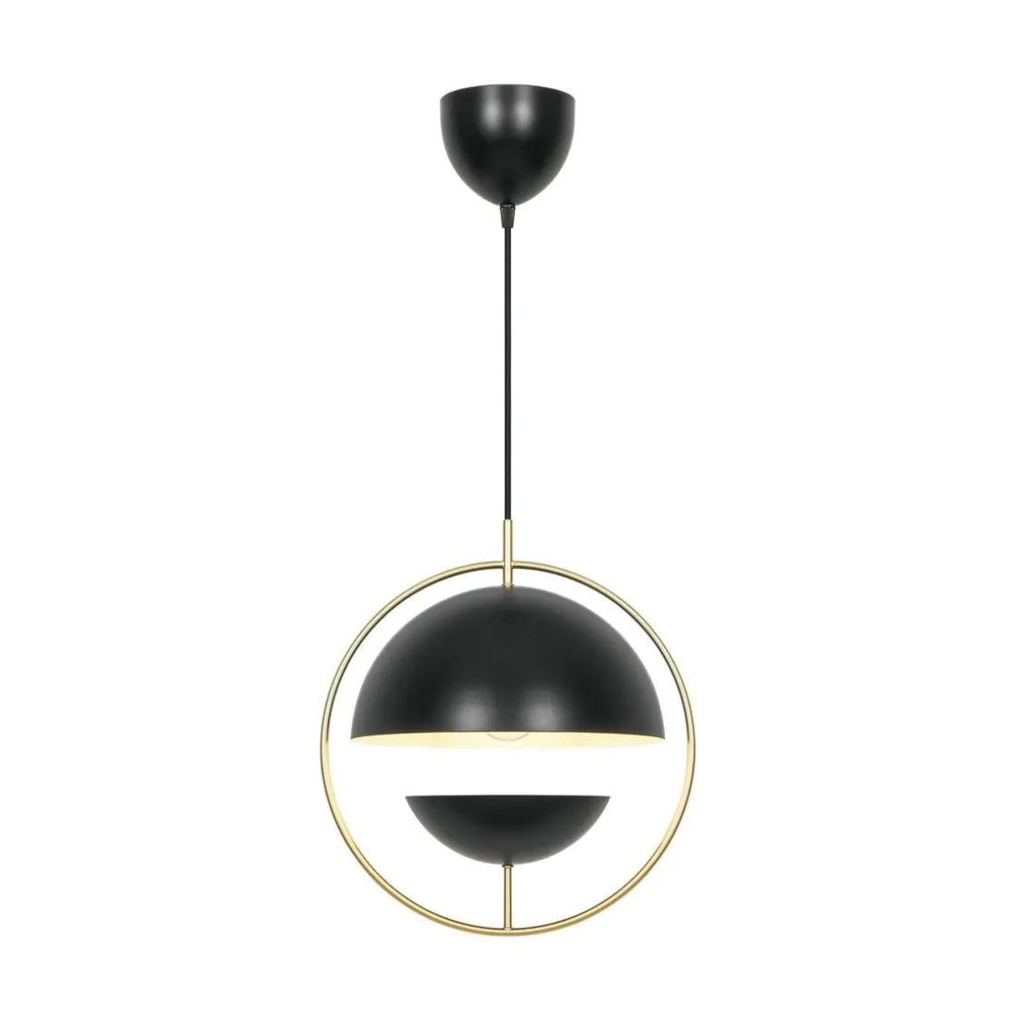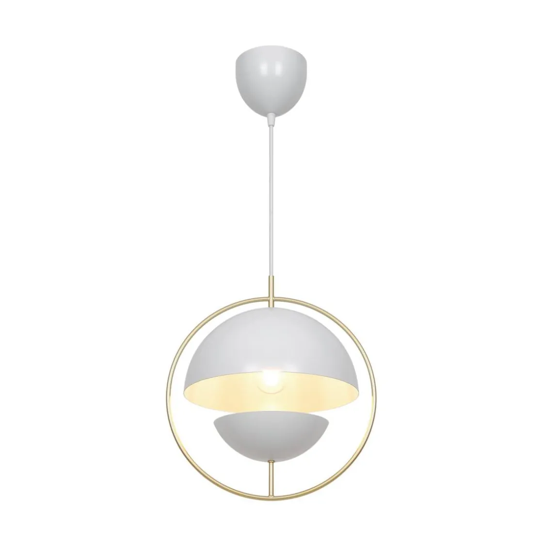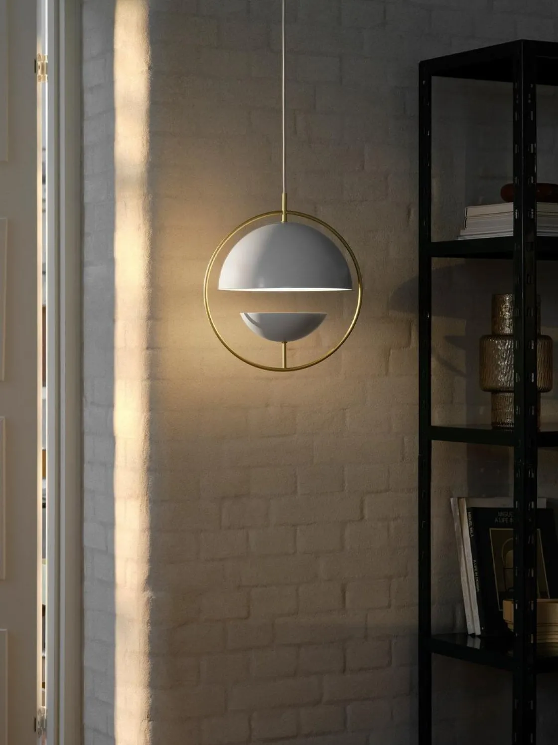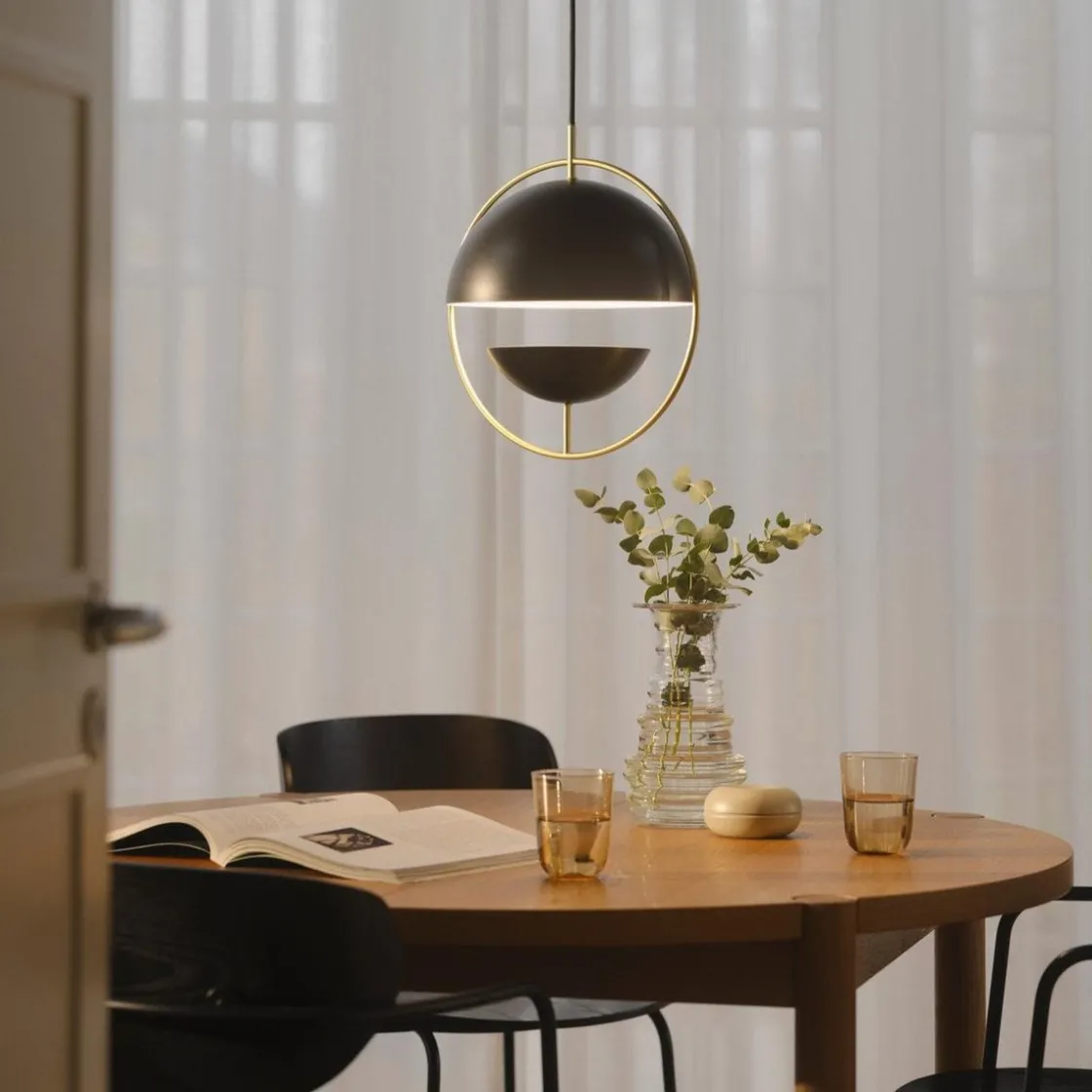 Pendellampen Tavia har et dekorativt design, som kombinerer minimalisme med et glamorøst preg. De to runde skjermene er plassert overfor hverandre, omsluttet av en elegant messingring. Gir et behagelig, diffust lys.
