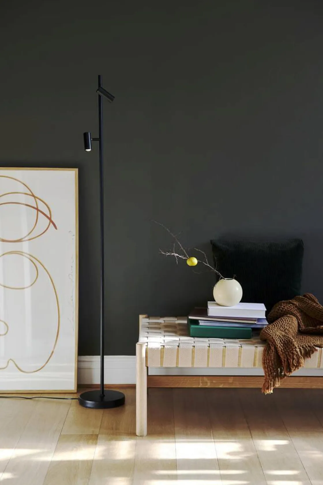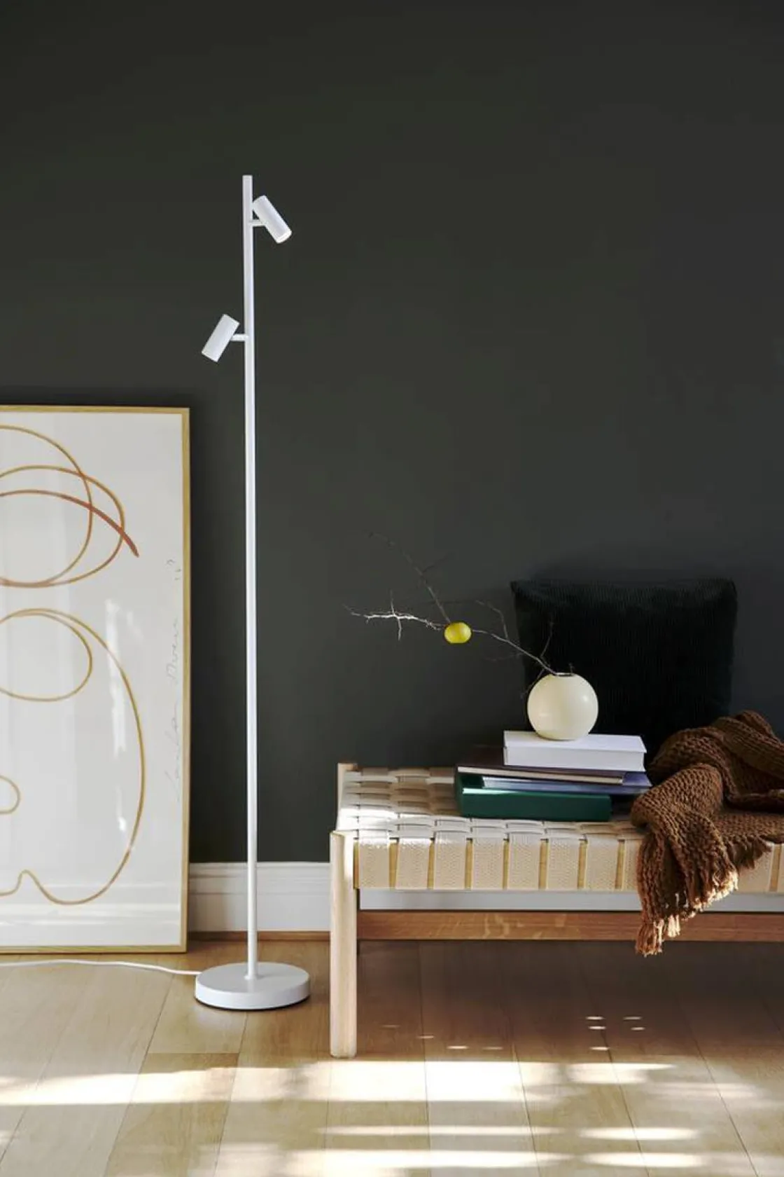 Omari avgir lette, rene og enkle nordiske linjer. Denne minimalistiske og strømlinjeformede gulvlampen har en av/på-berøringsbryter og dimmer på lampehodet. Plasser den i et koselig hjørne eller et annet sted du trenger et funksjonelt lys som lett kan justeres for å passe dine behov.