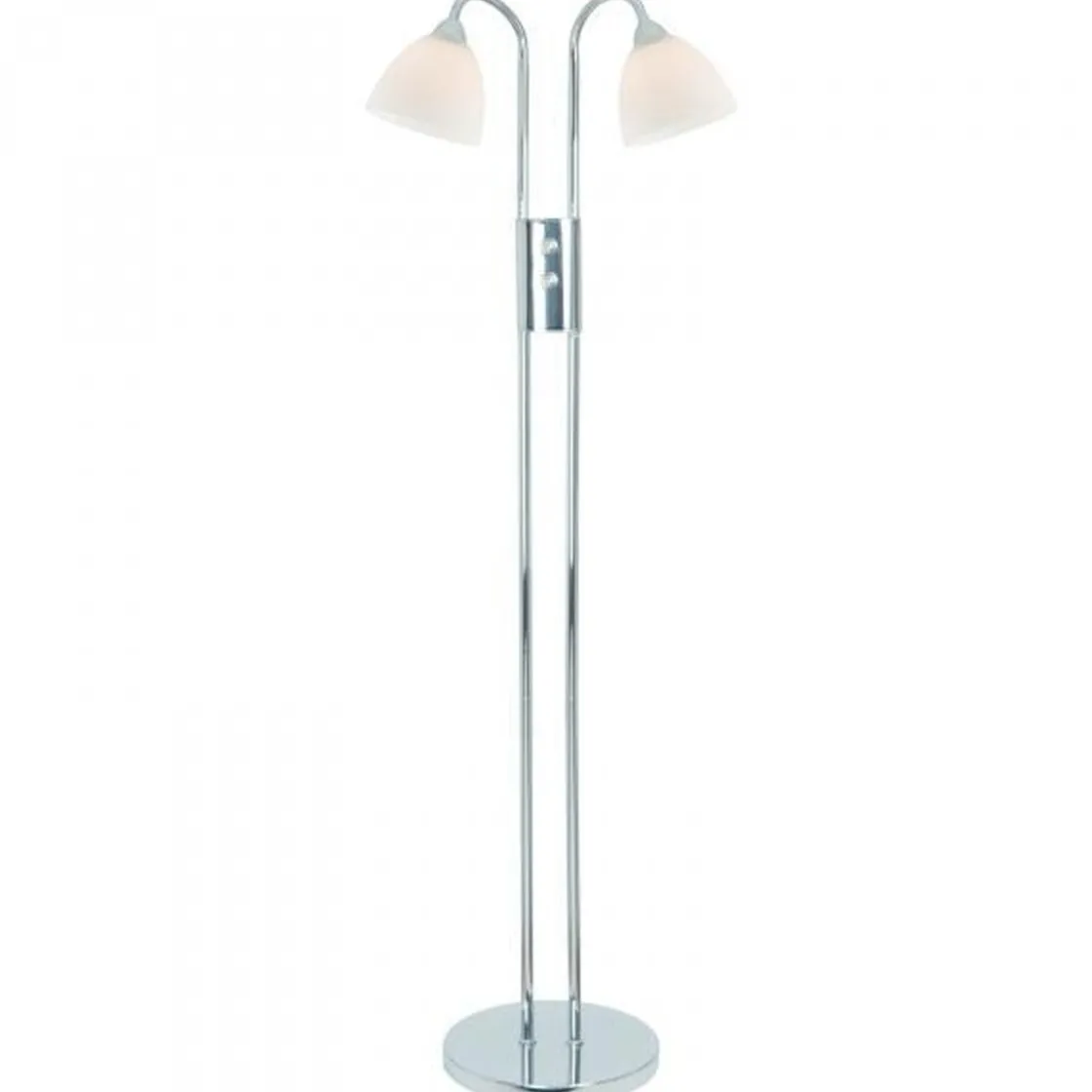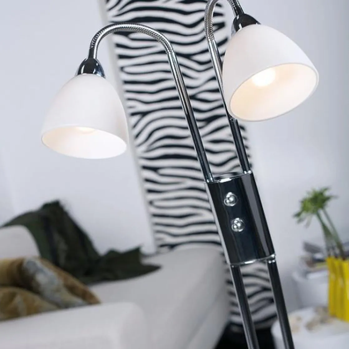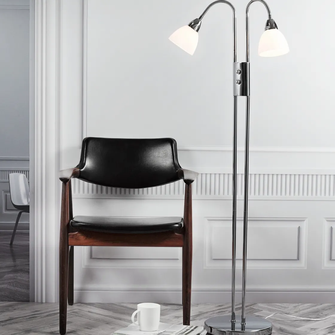 Stilig gulvlampe i polert krom med to fleksible armer.