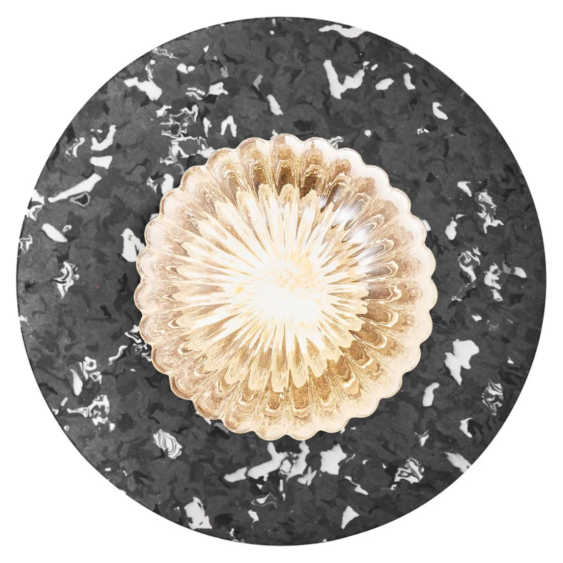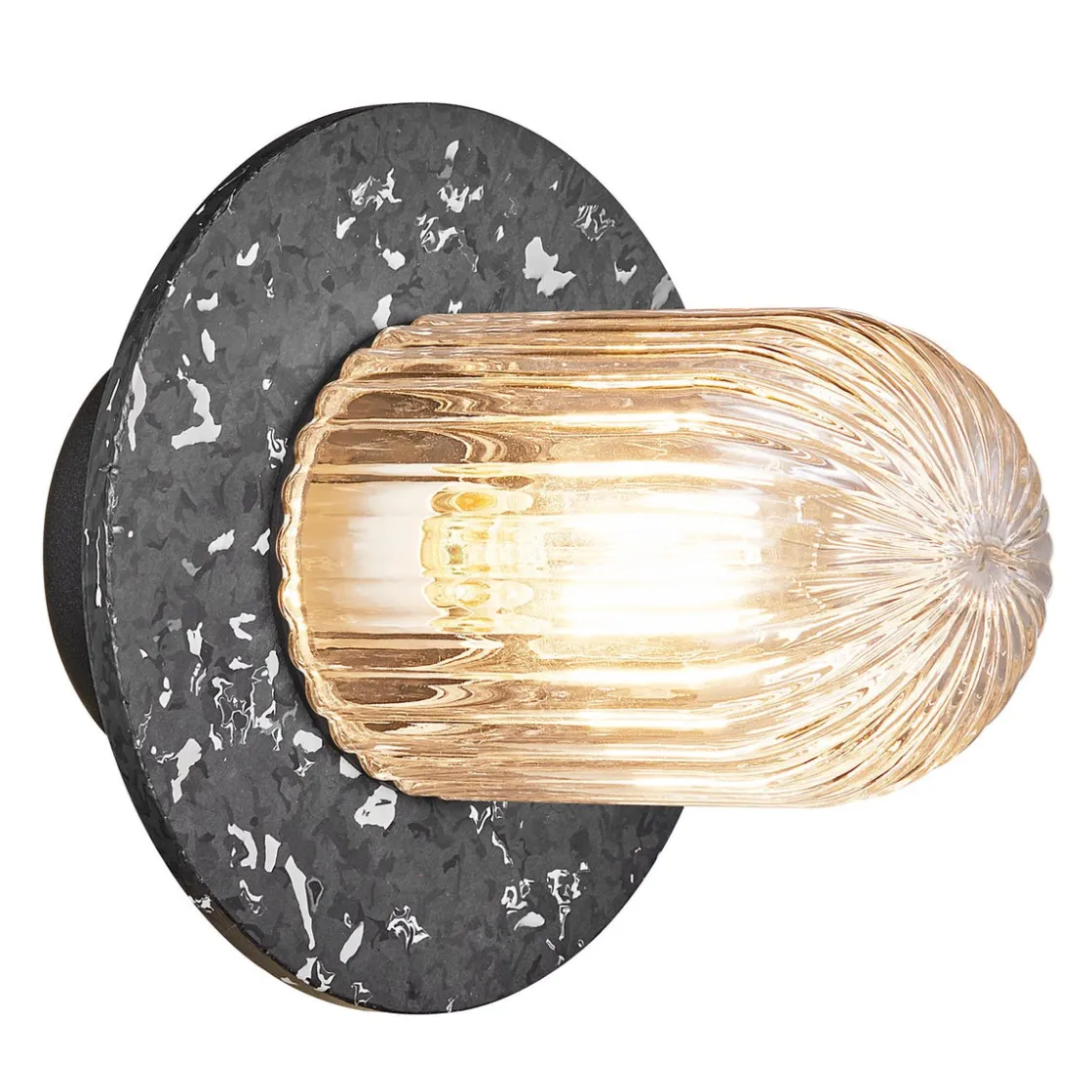 Januka er en serie utendørslamper med diffusor i ribbet glass og en skjerm av resirkulert plast. Designet er elegant og klassisk, og den flekkete skjermen med et terrazzo-aktig uttrykk gir lampene en moderne vri.