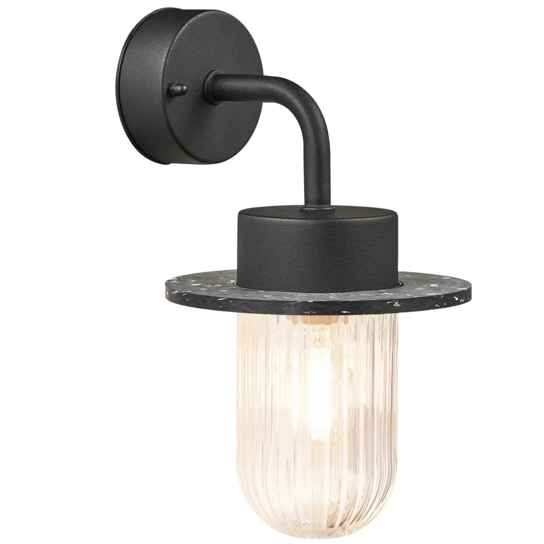 Januka er en serie utendørslamper med diffusor i ribbet glass og en skjerm av resirkulert plast. Designet er elegant og klassisk, og den flekkete skjermen med et terrazzo-aktig uttrykk gir lampene en moderne vri.