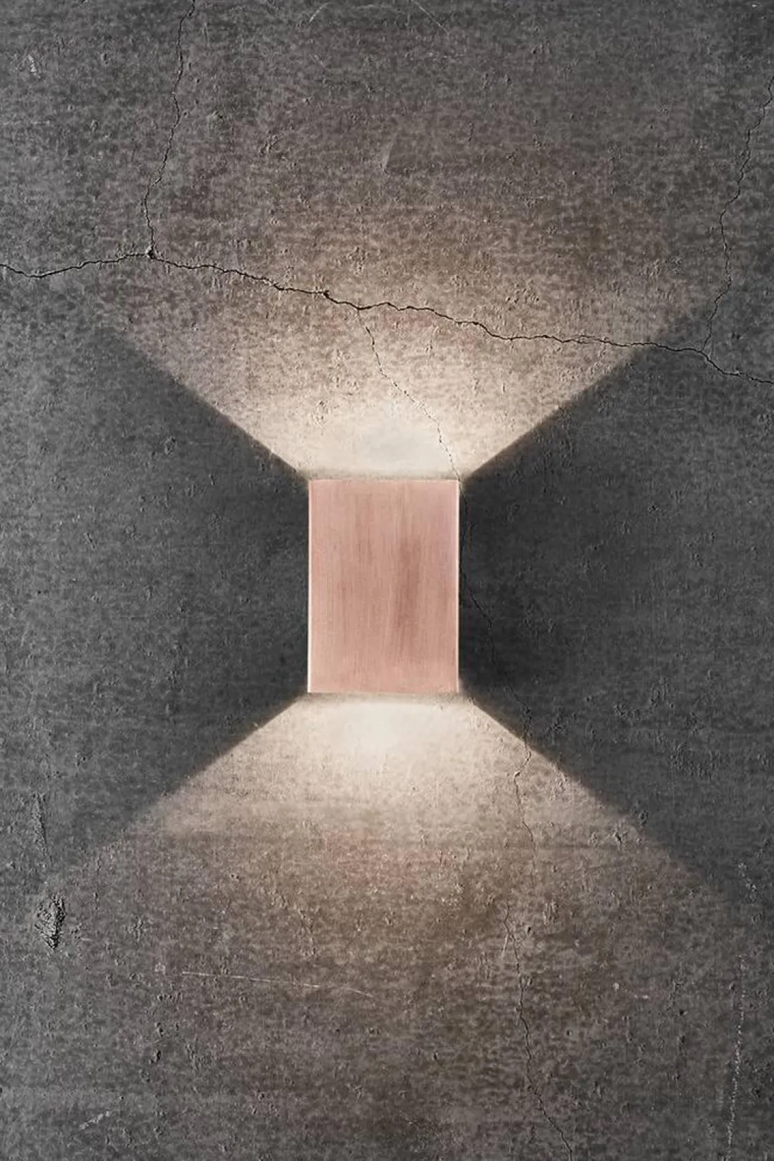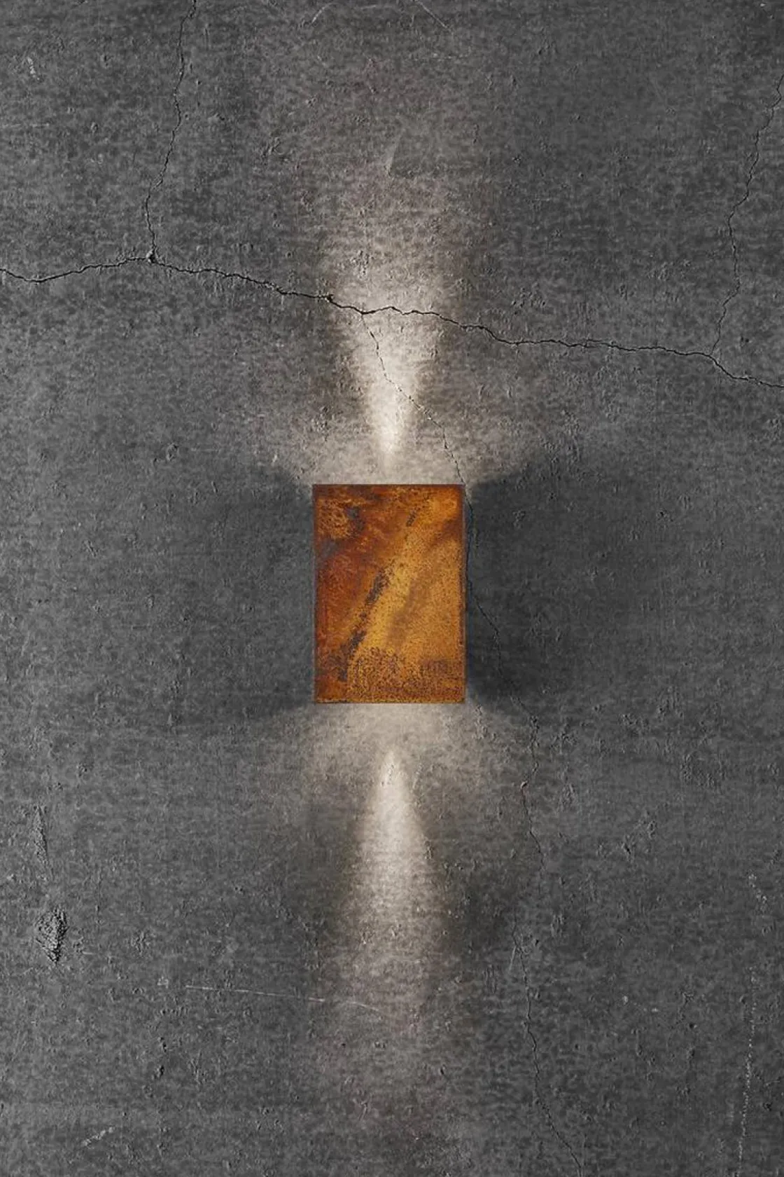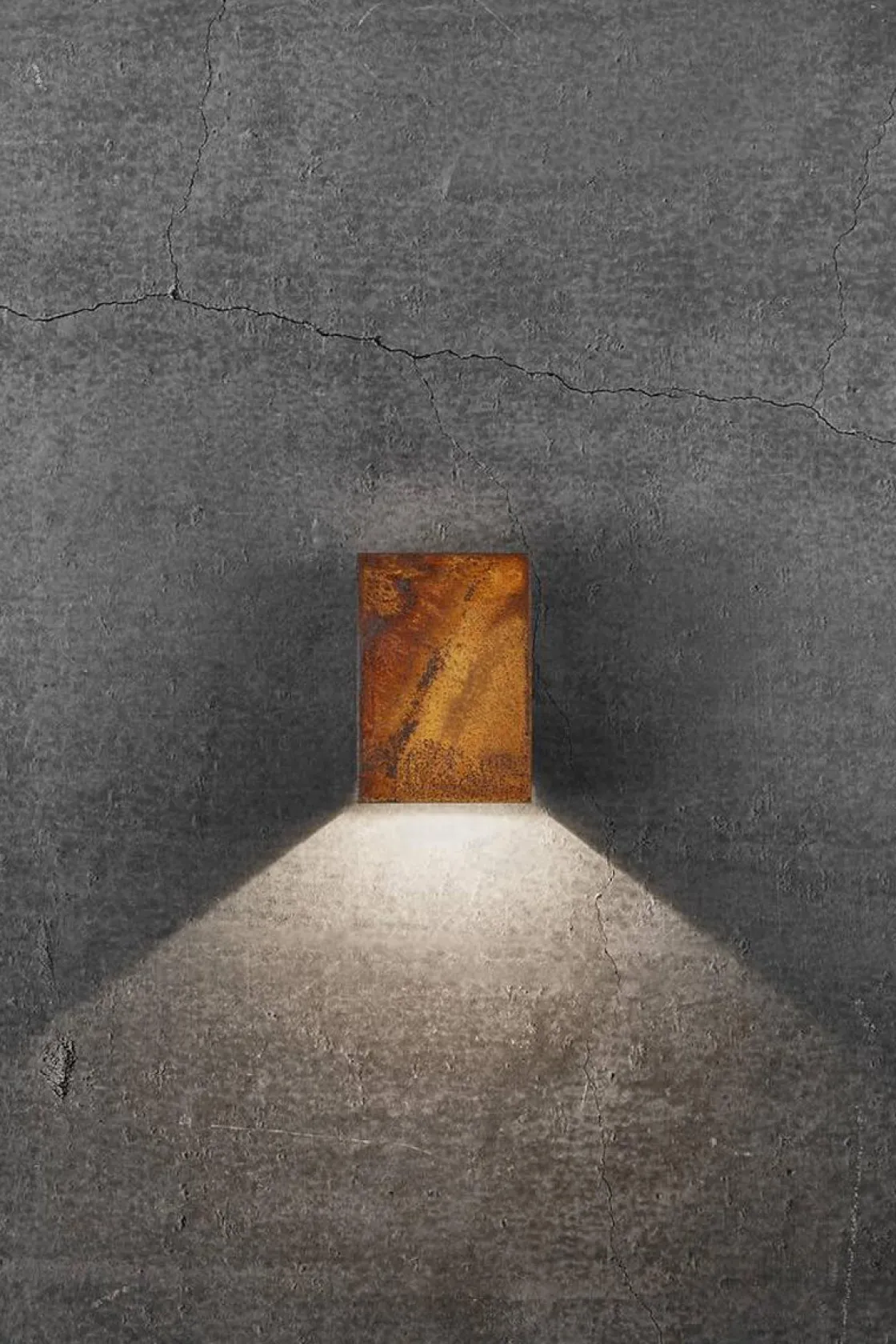 Denne lampen er en kun 1 cm bred miniatyrutgave av vår tradisjonelle Fold lampe som gir nye anvendelsesmuligheter. Bruk Fold i corten som orienteringslys nederst på veggen eller som et vakkert lysende kunstverk på badet eller i gangen.