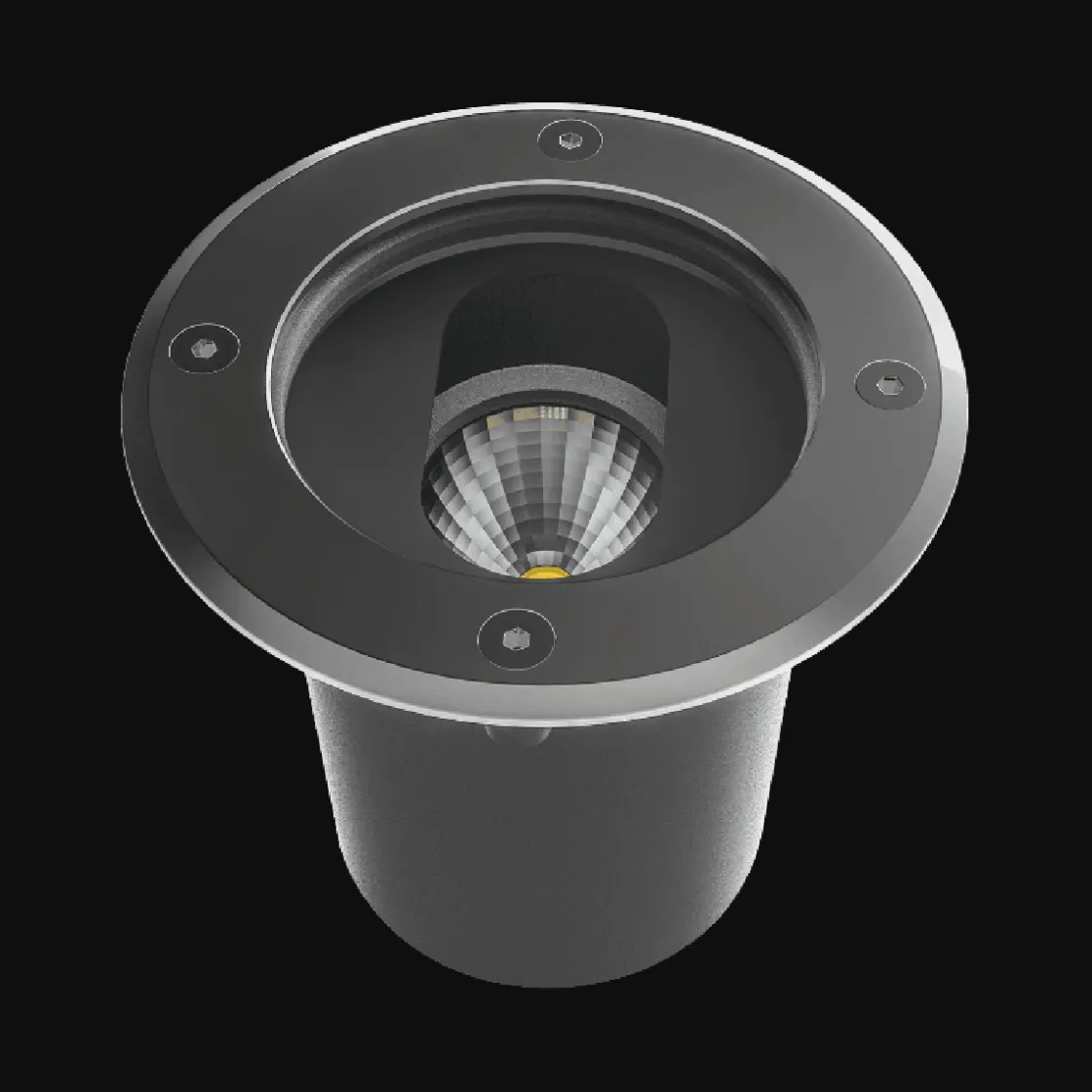 Utendørs spotlight for innfelling i bakken. Regor kan tiltes 15°, slik at den også kan stilles inn for å belyse for eksempel trær eller busker. Utførelse i børstet stål gir et solid inntrykk.