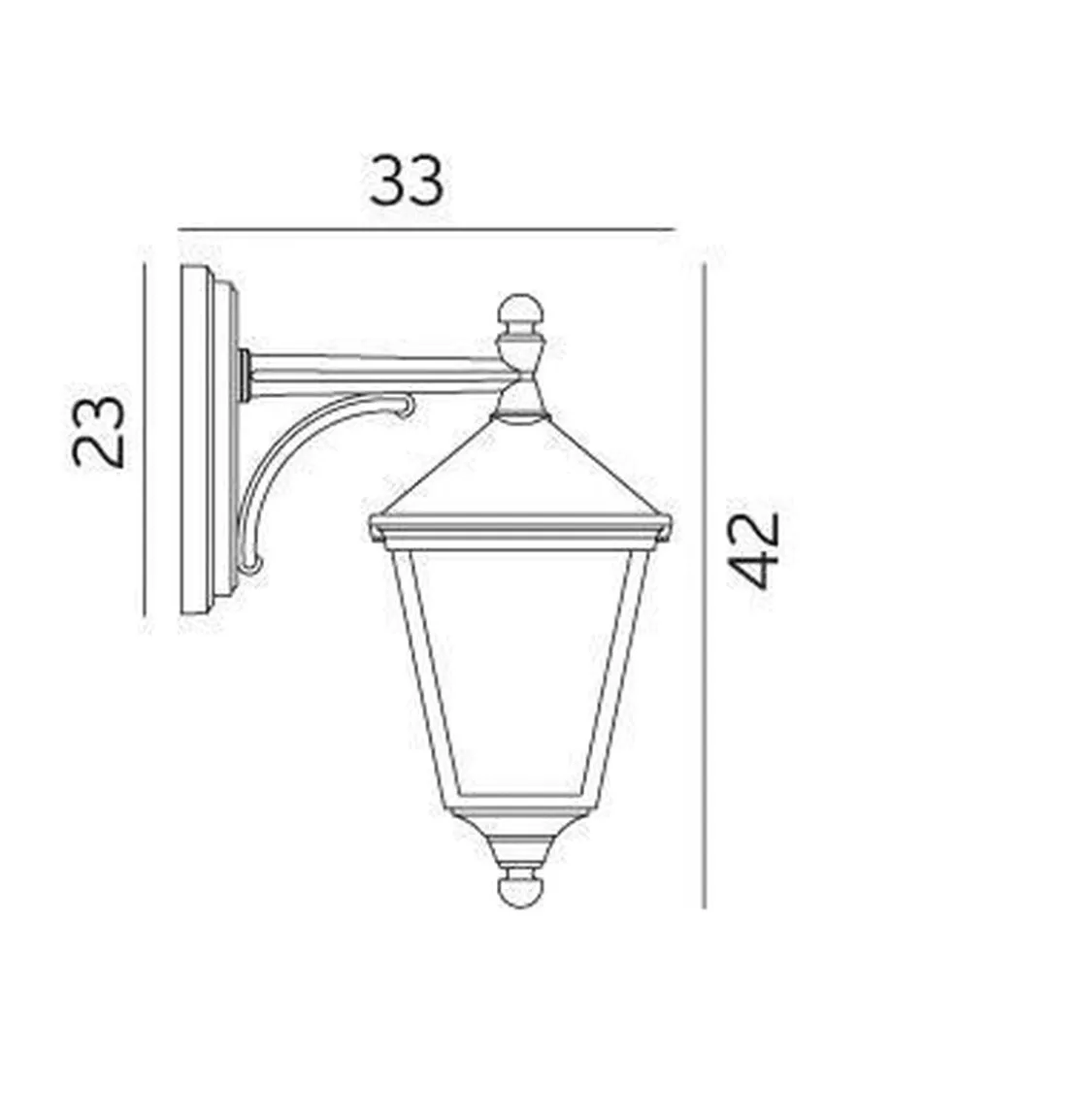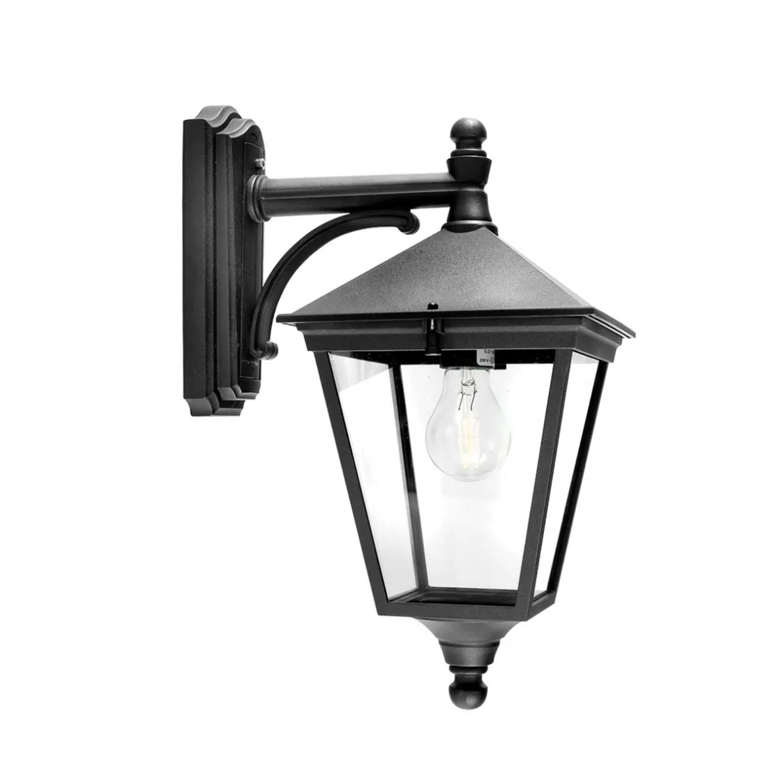 Flott utelampe i klassisk design som vender ned. Glasset er slagfast klar polykarbonat. Du behøver 1 stk lyspære med E27-sokkel til lampen.