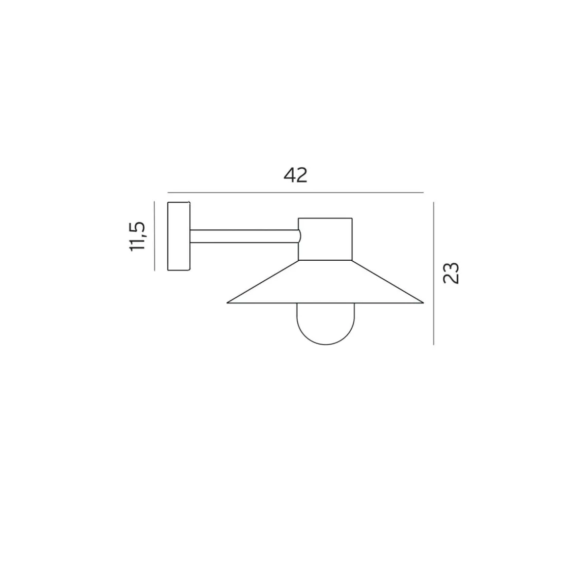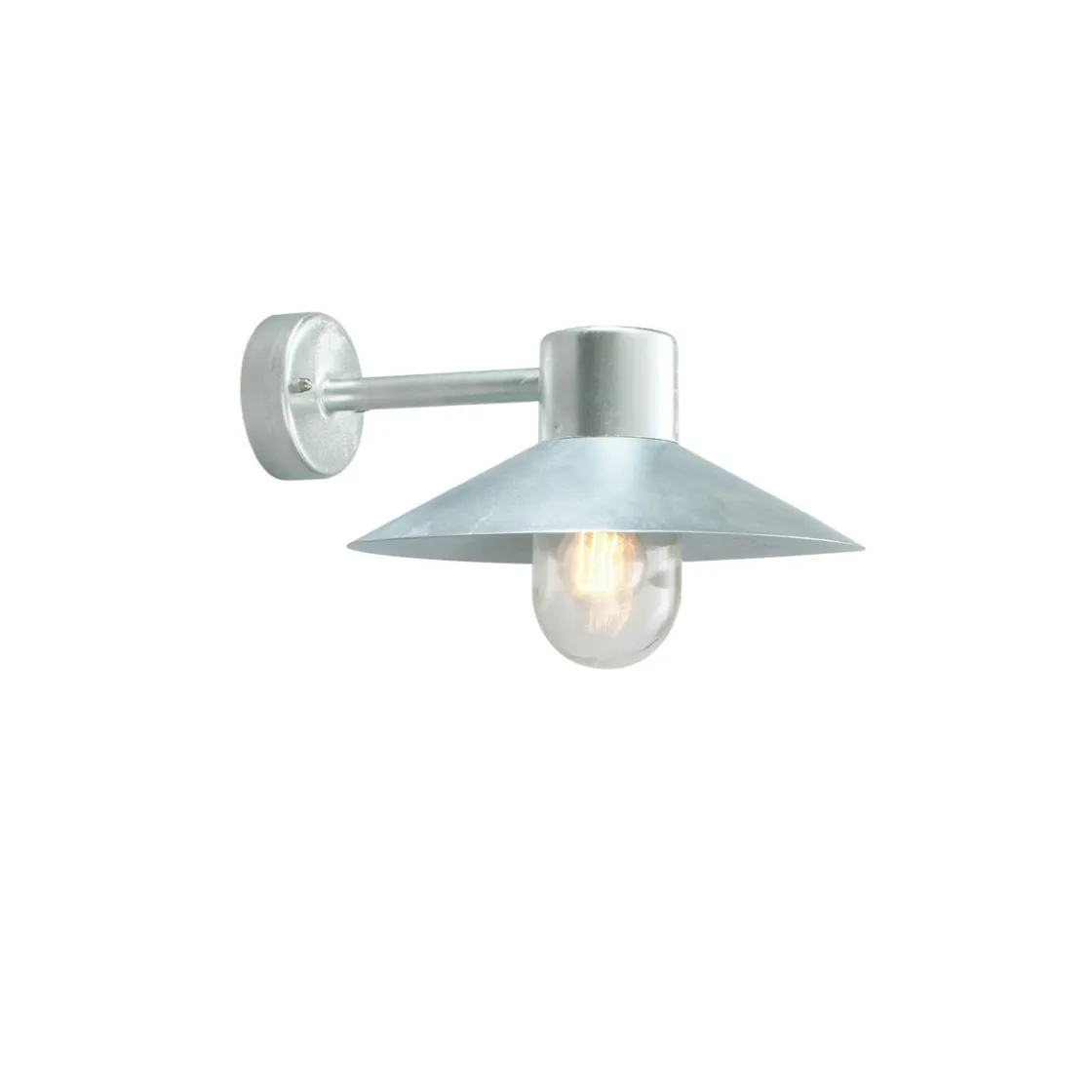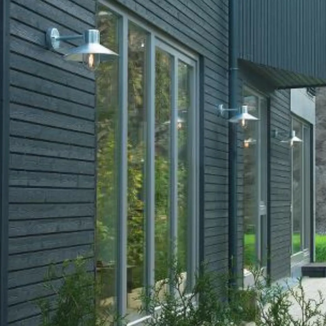 Moderne vegglampe. Armaturen har klart glass i polykarbonat. Opalhvitt eller frostet glass, samt hjørnefeste (art. 153) kan bestilles som tilbehør. Lund finnes i fargene galvanisert stål og sort
