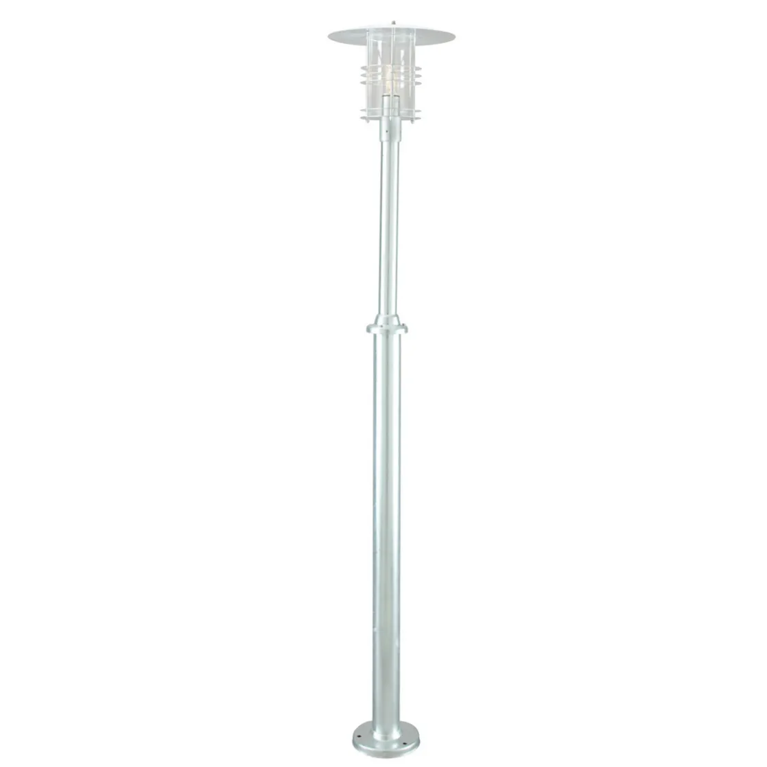 Stolpelampen leveres i fargene galvanisert stål og sort.