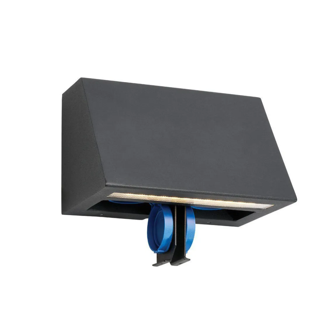 Nye veggarmaturer i galvanisert stål eller sort. Tilgjengelig med to stk. 230V kontakter. Utmerket 2 i 1 løsning for balkong/terrasse.