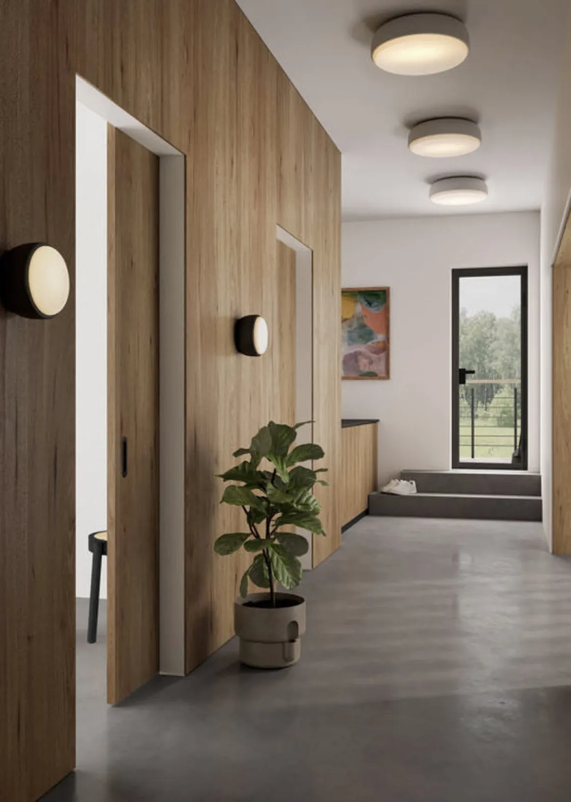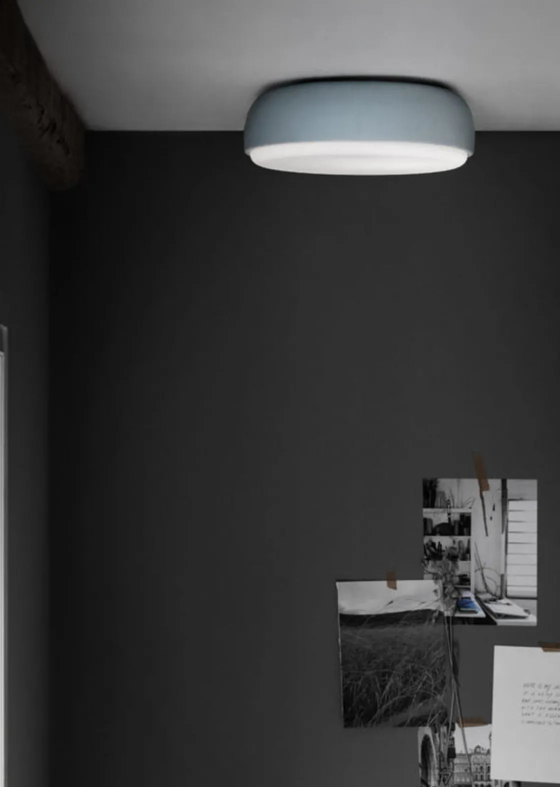 Over Me fra Northern kan brukes som taklampe eller vegglampe, og den kommer i flere størrelser og farger. En minimalistisk rund metallramme omkranser et stykke glass som mykner og sprer lyset på en fin måte. Her kan du ha mye lys i og den gir et generelt lys til rommet. Den passer i alle rom, og er også godkjent for bruk i våtrom.