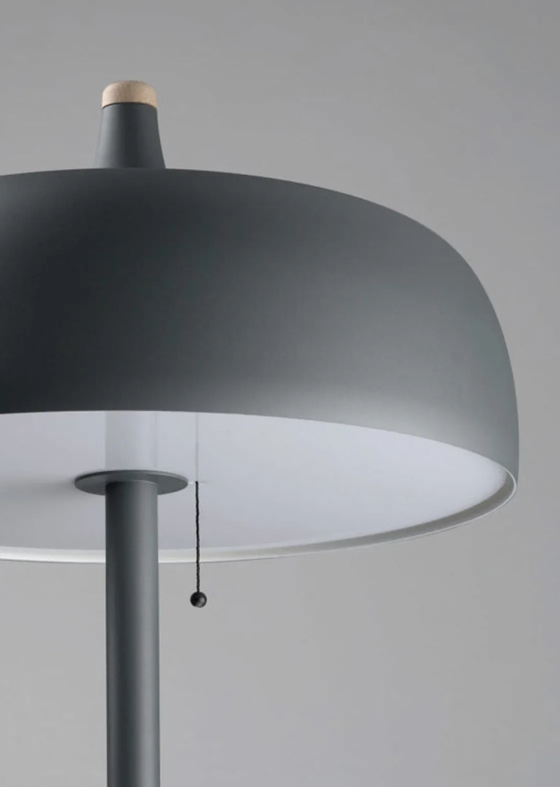 Acorn gulvlampe er tilgjengelig i hvit, mørkegrå og svart finish. Den har varme bøk- og valnøttdetaljer på aluminiumsskjermen, og en pen trekkbryter.