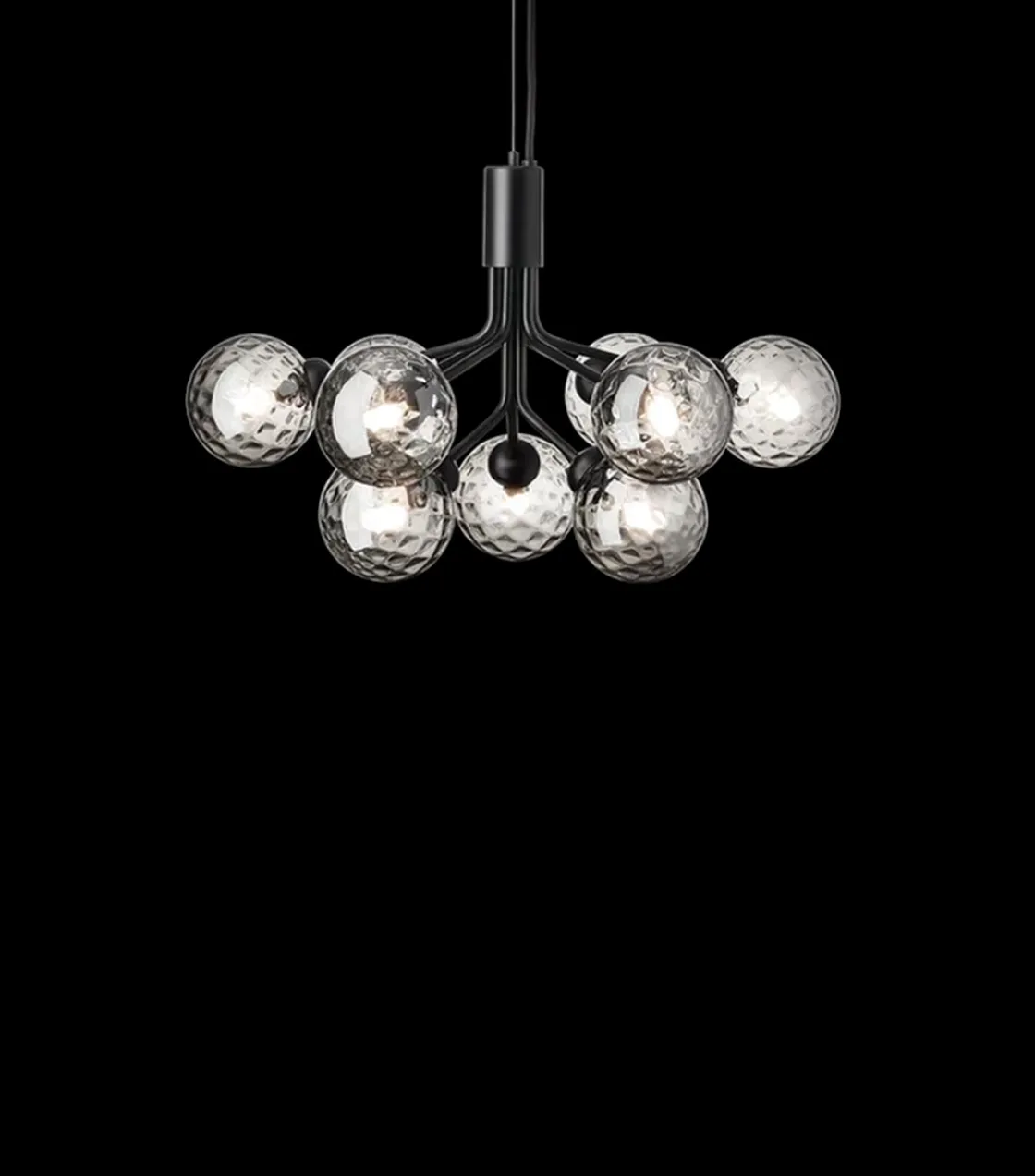 Inspirert av blomster har Sofie Refer designet Apiales-kolleksjonen. Samlingen består av to lysekroner med 9 eller 18 munnblåste glassbolter og er tilgjengelig i gylden Brush Brass-finish eller den glatte Satin Black. Armene på Apiales lysekrone minner om blomsterstilker som sprer et diffust og vakkert lys. Apiales 9, med sine 60 cm i diameter, passer over spisebordet, på soverommet eller i gangen.