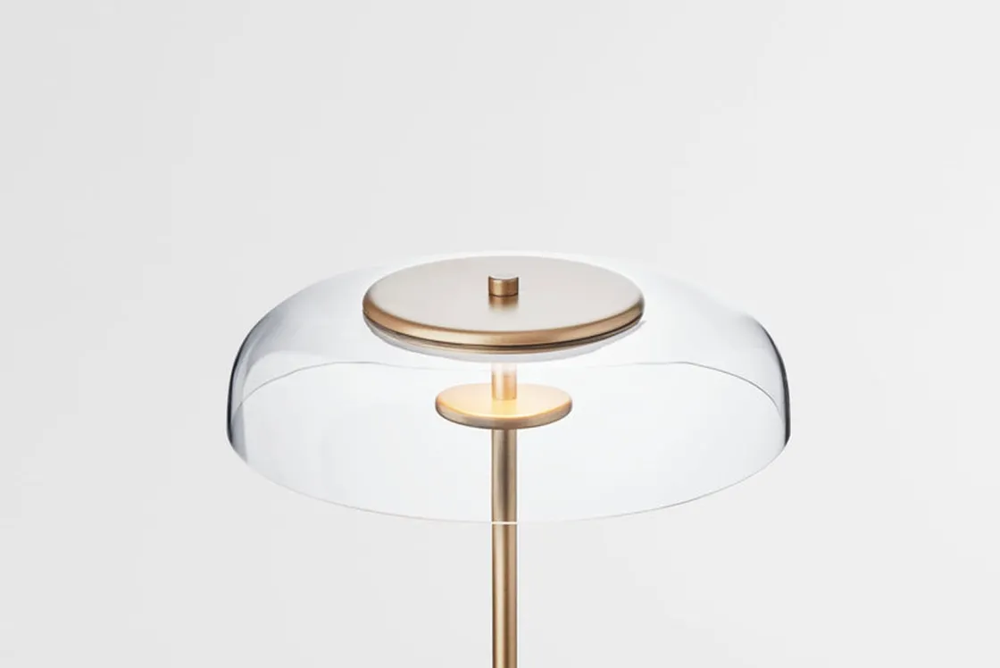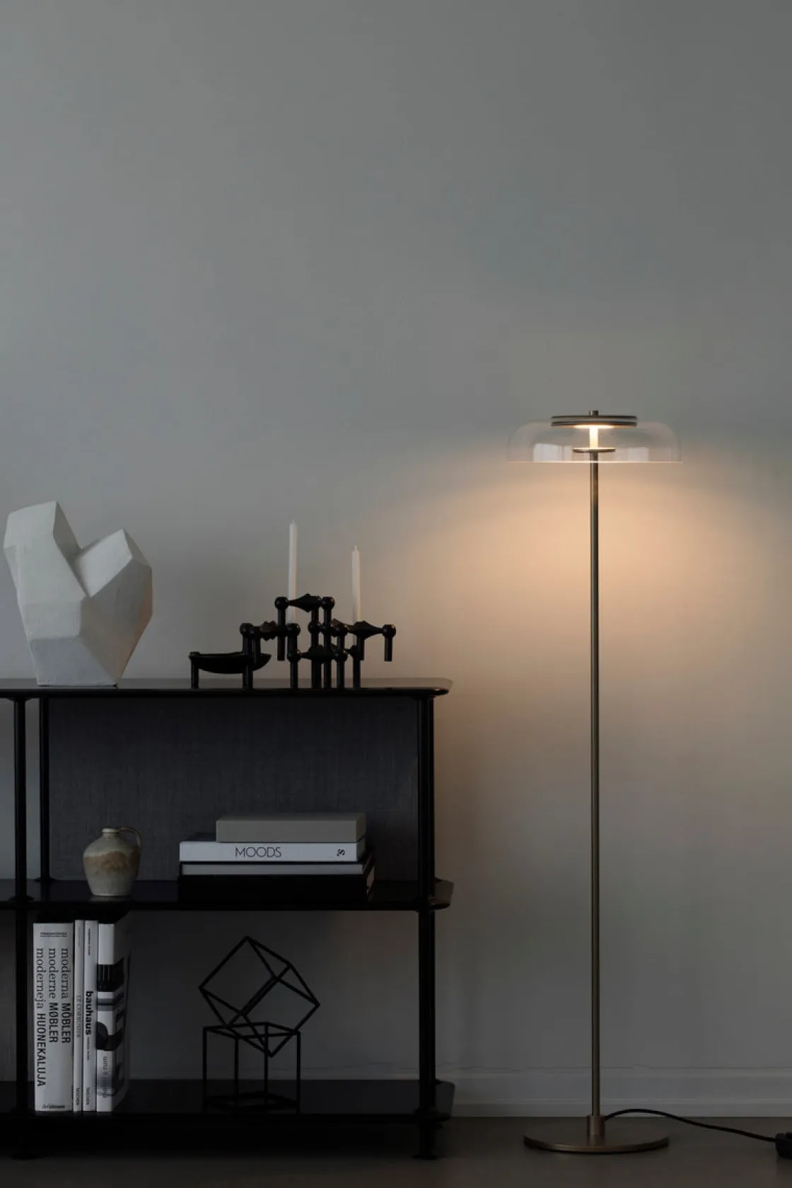 Blossi-kolleksjonen er laget med den nyeste LED-teknologien. En spesialutviklet LED-plate er plassert slik at lyset reflekteres i den munnblåste glasskjermen og gulvlampen har et gyldent metall som sprer et mykt og sofistikert indirekte lys. Kabel med dimmer.