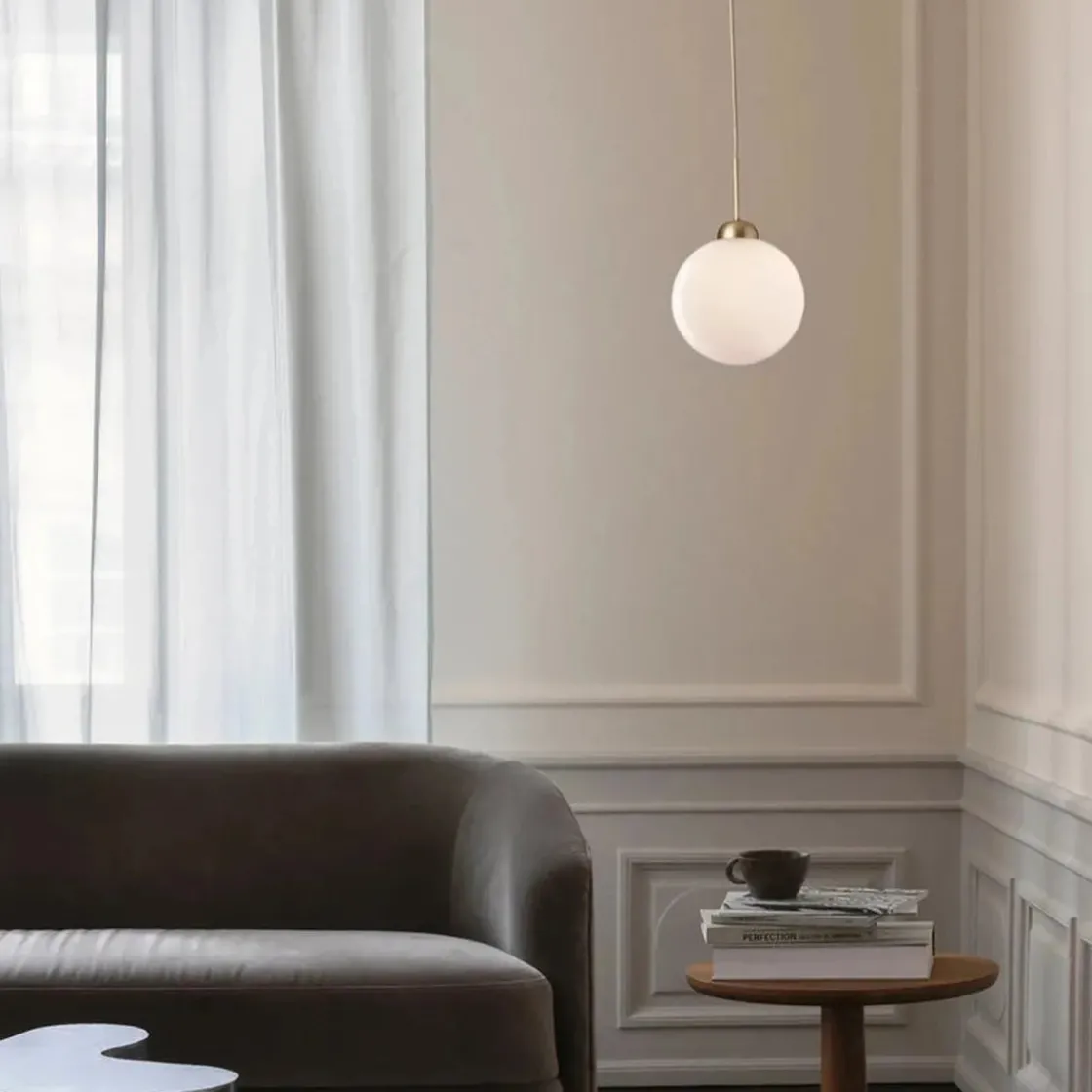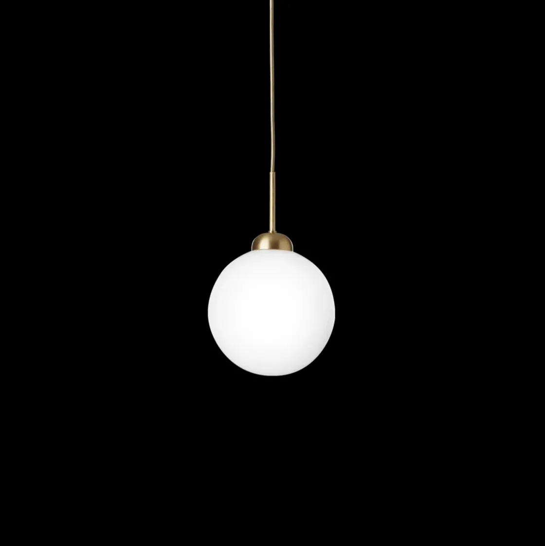 Apiales 1 Large har en stor kuppel av opalhvitt glass som gir et jevnt lys og som henger i en slank metallstamme i børstet messingfinish – en kombinasjon som koordinerer godt med andre metaller og farger.