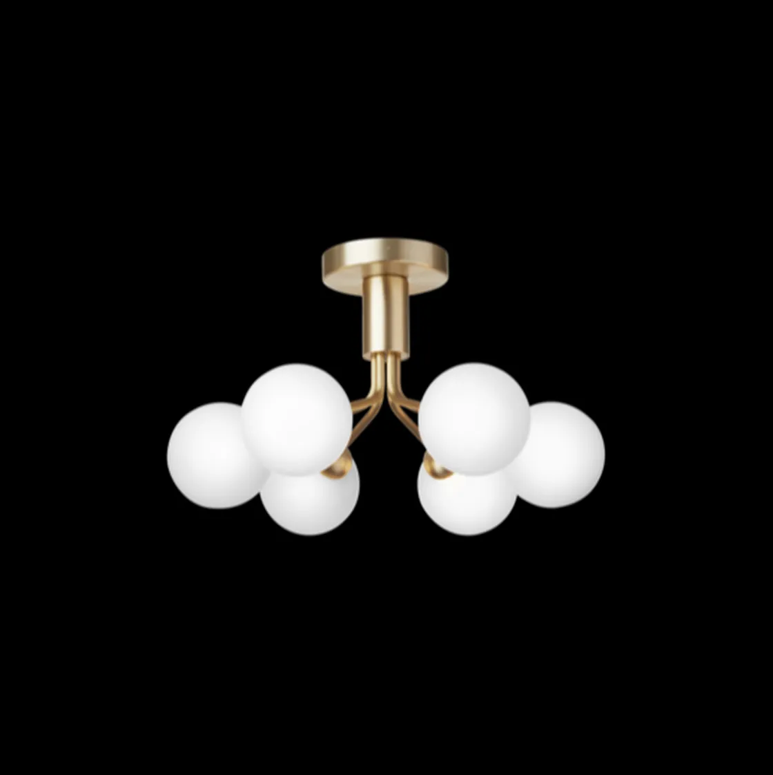 Med inspirasjon fra blomster bretter Apiales 6 Ceiling ut sine 6 metallarmer i børstet messing som blomsterstilker fra en spesialprodusert baldakin og støtter 6 munnblåste glasskuler i opalhvitt.
