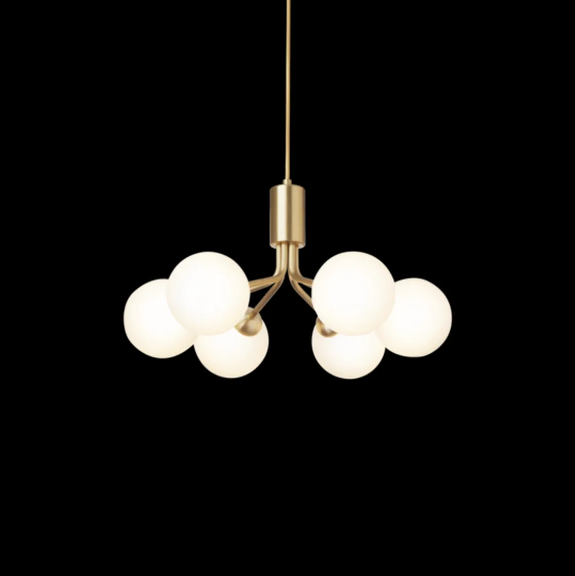 Med inspirasjon fra blomster, bretter Apiales 6 ut de børstede messingmetallstilkene til opalhvite glasskuler, og tilbyr et mykt og behagelig uttrykk til rom med begrenset plass.