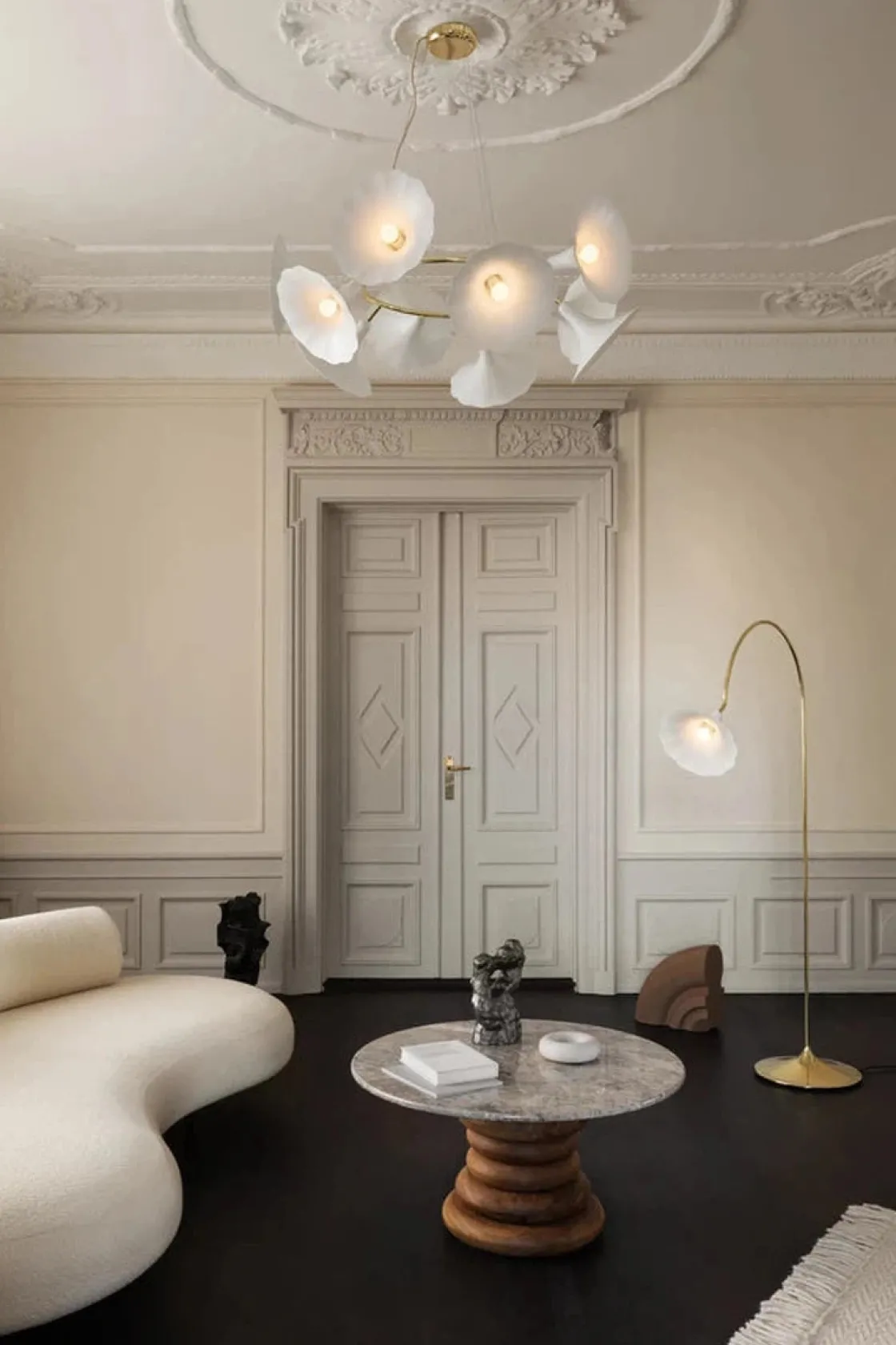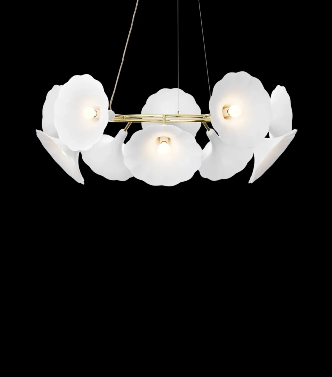 Petalii 10 taklampe fra Nuura er en iøynefallende lysekrone designet av Nika Zupanc. Denne belysningsdekorasjonen består av 10 blomstrende blomster i hvitt metall som henger fra en metallring i polert messing for å skape et romantisk uttrykk. Petalii 10 lysekrone er et samtaleobjekt og fremkaller interessante historier i en innredning. Lysekronen er ideell som et midtpunkt som lyser opp stuen eller som en prosjektlysekrone plassert i en lobby.