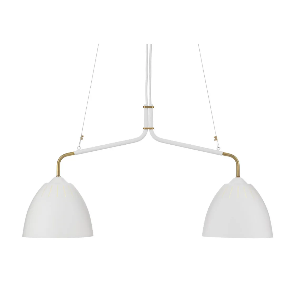 Lean er tilgjengelig i matt svart og hvit teksturfarge. Taklampen med to lyskilder, sprer lyset fint over spisebordet og tilfører en fin formdetalj til rommet. Små solide brett i rå messing følger med i wireopphenget og blir en flott ekstra detalj.