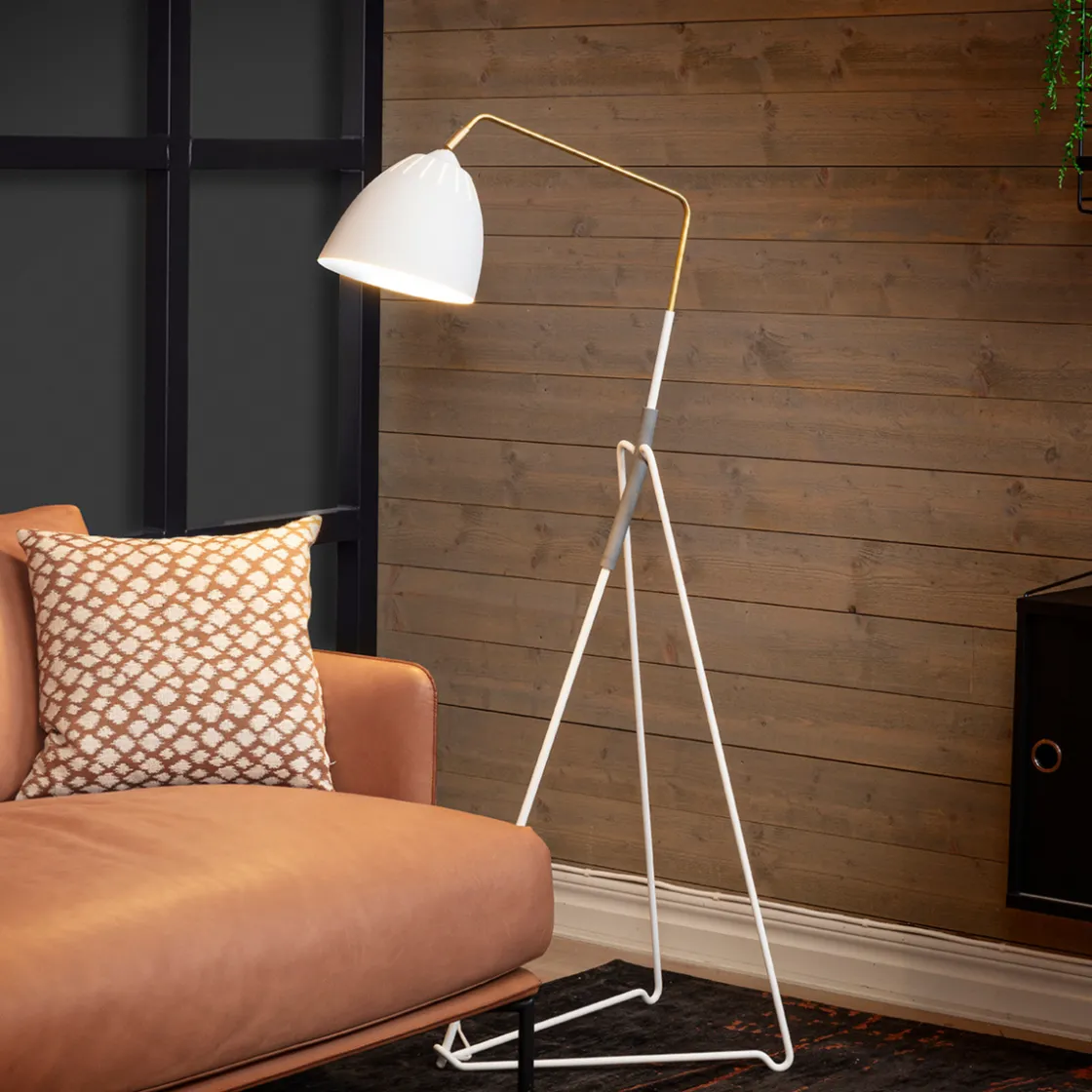 Lean er tilgjengelig i matt svart og hvit teksturfarge. Gulvlampens skrå arm strekker seg praktisk over en sofa eller lenestol, og den justerbare skjermen gir et komfortabelt leselys.
